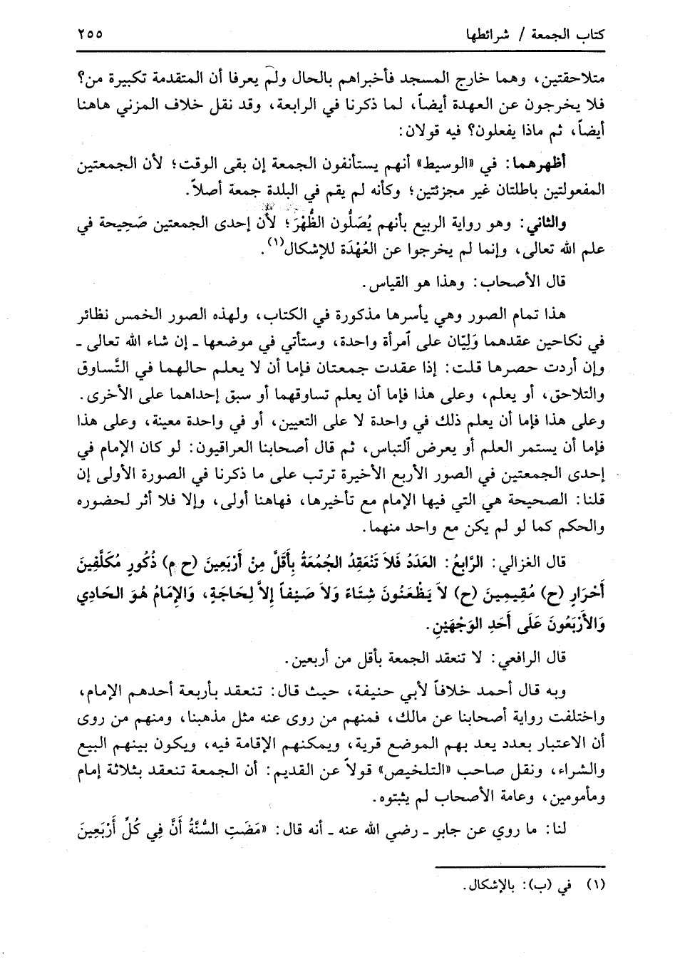 قال الغزالي: الرَّابعُ: العَدَدُ فَلاَ تَنْعَقِدُ الجُمُعَةُ بِأقَلَّ مِنْ أَرْبَعِينَ (ح م) ذُكُورٍ مُكَلَّفِينَ أَحْرَارٍ (ح) مُقِيمِينَ (ح) لاَ يَظْعَنُونَ شِتَاءً وَلاَ صَيْفاً إلاَّ لِحَاجَةٍ، وَالإِمَامُ هُوَ الحَادِي وَالأَرْبَعُونَ عَلَى أَحَدِ الوَجْهَيْنِ.