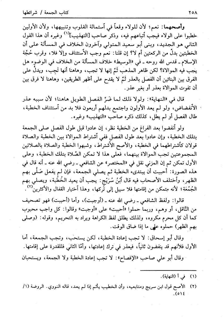 (¬2) الأصح قول ابن سريج ومتابعيه، وأن الخطيب يأثم إذا لم يعد، قاله النووي. الروضة (1/ 514).