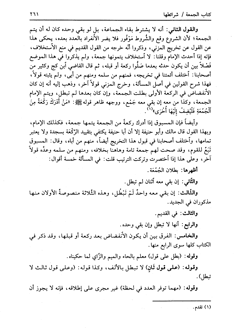 وأيضاً فإن المسبوق إذا أدرك ركعةً من الجمعة يتمها جمعة، فكذلك الإمام، وبهذا القول قال مالك وأبو حنيفة إلا أن أبا حنيفة يكتفي بتقييد الرَّكْعَة بسجدة ولا يعتبر تمامها، واختلف أصحابنا في قبول هذا التخريج أيضاً، منهم من أباه، وقال: المسبوق تَبَعٌ للقوم، وقد صحت لهم جمعة تامة وهاهنا بخلافه، ومنهم من سلمه وعدَّه قولاً آخر، وعلى هذا إذا اختصرت وتركت الترتيب قلت: في المسألة خمسة أقوال: