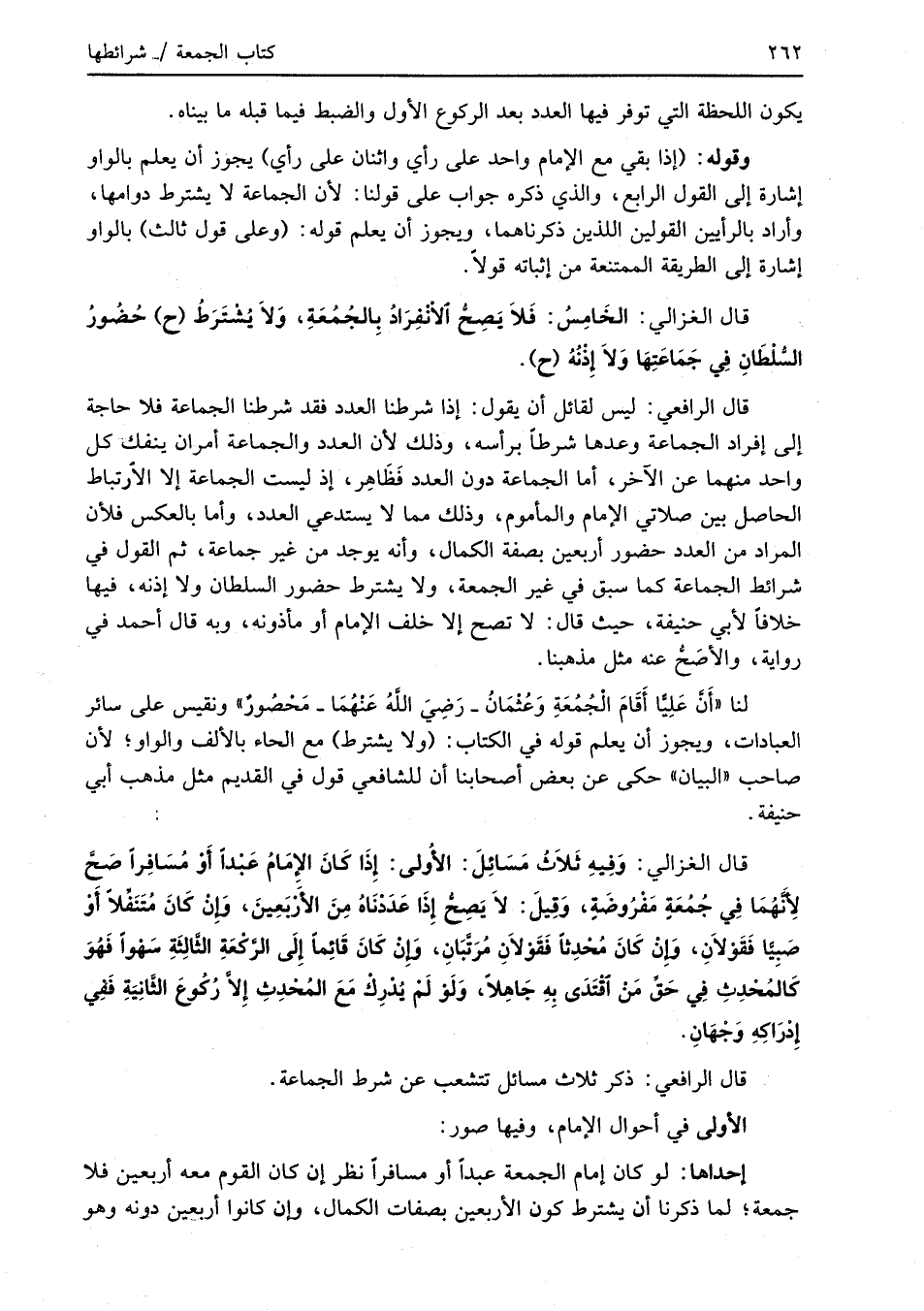 قال الغزالي: الخَامِسُ: فَلاَ يصِحُّ الانْفِرَادُ بِالجُمُعَةِ، وَلاَ يُشْتَرَطُ (ح) حُضُورُ السُّلْطَانِ فِي جَمَاعَتِهَا وَلاَ إِذْنُهُ (ح).