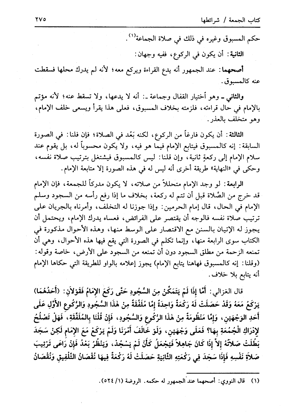 قال الغزالي: أَمَّا إِذَا لَمْ يَتَمَكَّنْ مِنَ السُّجُودِ حَتَّى رَكَعَ الإمَامُ فَقَوْلاَنِ: (أَحَدُهُمَا) يَرْكَعُ مَعَهُ وَقَدْ حَصَلَتْ لَهُ رَكْعَةٌ وَاحِدَةٌ إِما مُلَفَّقَةٌ مِنْ هذَا السُّجُودِ وَالرُّكُوعِ الأَوَّلِ عَلَى أَحَدِ الوَجْهَيْنِ، وَإِمَّا مَنْظُومَةٌ مِنْ هذَا الرُّكُوعِ وَالسُّجُودِ، فَإِنْ قُلْنَا بِالمُلَفَّقَةِ، فَهَلْ تَصْلُحُ لِإدْرَاكِ الْجُمُعَةِ بِهَا؟ فَعَلَى وَجْهَيْنِ، وَلَوْ خَالَفَ أَمْرَنَا وَلَمْ يَرْكَعْ مَعَ الإِمَامِ لَكنْ سَجَدَ بَطُلَت صَلاَتهُ إلاَّ إِذَا كَانَ جَاهِلاً فَيُجْعَلُ كأَنْ لَمْ يَسْجُدْ، وَيَنْظُرُ بَعْدُ فَإِنْ رَاعَى تَرْتِيبَ صَلاَةِ نَفْسِهِ فَإِذَا سَجَدَ فِي رَكْعَتِهِ الثَّانِيَةِ حَصَلَتْ لَهُ رَكْعَةٌ فِيهَا نُقْصَانُ التَّلْفِيقِ وَنُقْصَانُ