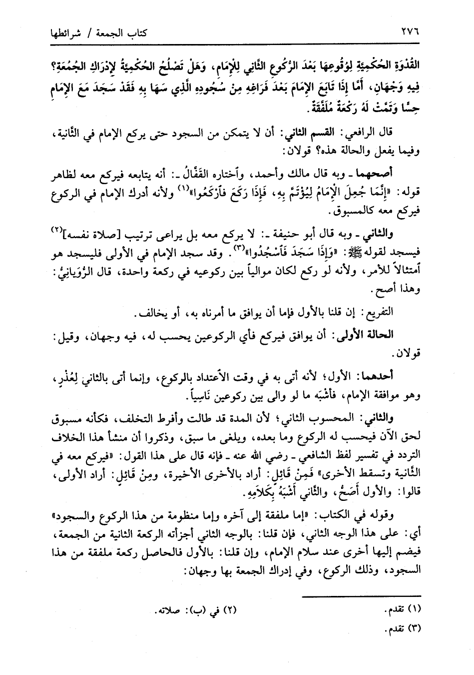 والثاني: المحسوب الثاني؛ لأن المدة قد طالت وأفرط التخلف، فكأنه مسبوق لحق الآن فيحسب له الركوع وما بعده، ويلغى ما سبق، وذكروا أن منشأ هذا الخلاف التردد في تفسير لفظ الشافعي -رضي الله عنه- فإنه قال على هذا القول: "فيركع معه في الثَّانية وتسقط الأخرى" فَمِنْ قَائِل: أراد بالأخرى الأخيرة، ومِن قَائِلٍ: أراد الأولى، قالوا: والأول أَصَحُّ، والثَّاني أَشْبَهُ بِكَلاَمِهِ.