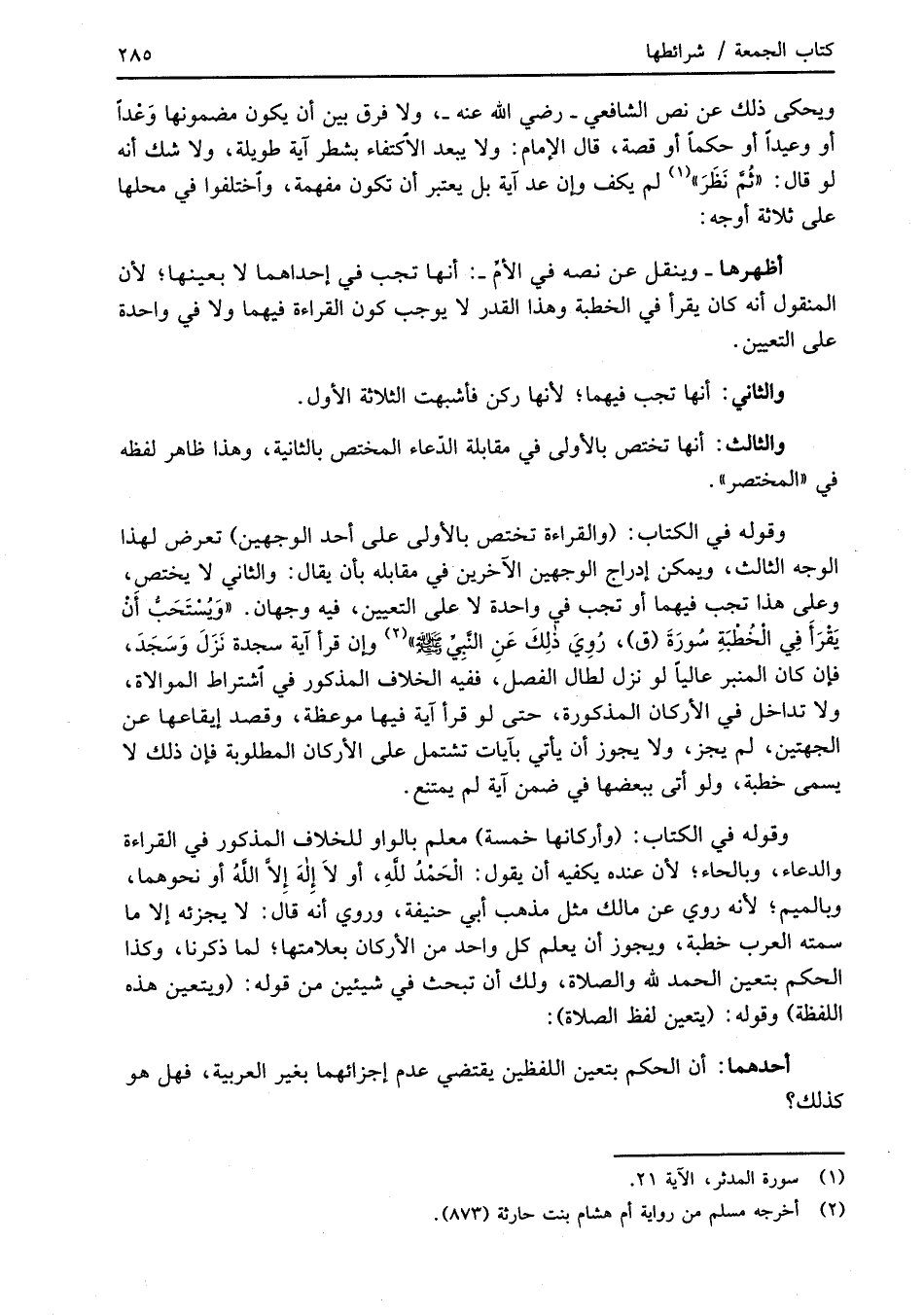 وقوله في الكتاب: (وأركانها خمسة) معلم بالواو للخلاف المذكور في القراءة والدعاء، وبالحاء؛ لأن عنده يكفيه أن يقول: الْحَمْدُ للهِ، أو لاَ إِلهَ إِلاَّ اللهُ أو نحوهما، وبالميم؛ لأنه روي عن مالك مثل مذهب أبي حنيفة، وروي أنه قال: لا يجزئه إلا ما سمته العرب خطبة، ويجوز أن يعلم كل واحد من الأركان بعلامتها؛ لما ذكرنا، وكذا الحكم بتعين الحمد لله والصلاة، ولك أن تبحث في شيئين من قوله: (ويتعين هذه اللفظة) وقوله: (يتعين لفظ الصلاة):