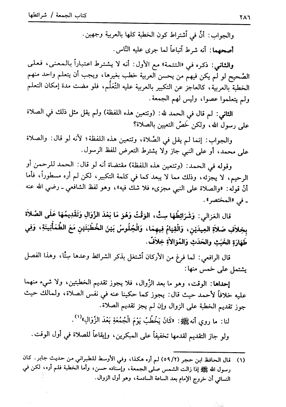 قال الغزالي: وَشَرَائِطُهَا سِتٌّ، الوَقْتُ وَهُوَ مَا بَعْدَ الزَّوَالِ وَتَقْدِيمُهَا عَلَى الصَّلاَة بِخِلاَفِ صلاَةِ العِيدَيْنِ، وَالْقِيَامُ فِيهِمَا، وَالْجُلُوسُ بَيْنَ الخُطْبَتَيْنِ مَعَ الطَّمَأْنِينَةِ، وَفِي طَهَارَةِ الخَبَثِ والحَدَثِ وَالمُوَالاَةِ خِلاَفٌ.