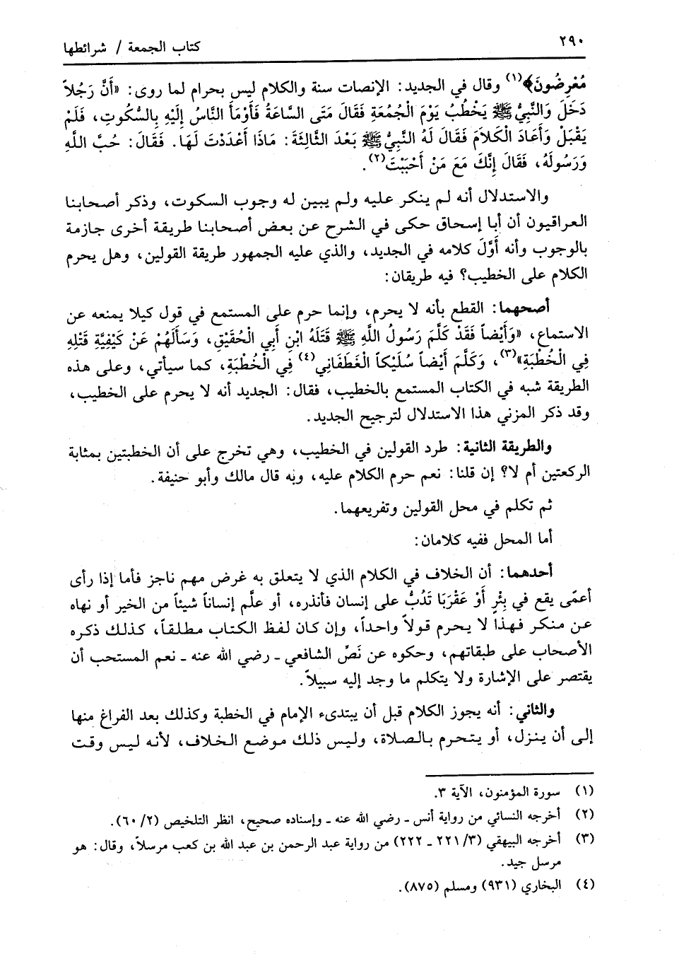 والاستدلال أنه لم ينكر عليه ولم يبين له وجوب السكوت، وذكر أصحابنا العراقيون أن أبا إسحاق حكى في الشرح عن بعض أصحابنا طريقة أخرى جازمة بالوجوب وأنه أَوَّلَ كلامه في الجديد، والذي عليه الجمهور طريقة القولين، وهل يحرم الكلام على الخطيب؟ فيه طريقان:
