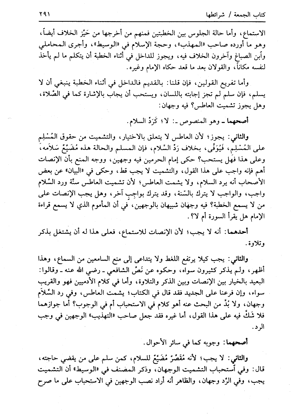والثاني: يجب كيلا يرتفع اللغط ولا يتداعى إلى منع السامعين من السماع، وهذا أظهر، ولم يذكر كثيرون سواه، وحكوه عن نَصِّ الشافعي -رضي الله عنه- وقالوا: البعيد بالخيار بين الإنصات وبين الذكر والتلاوة، وأما في كلام الأدميين فهو والقريب سواء، وإن فرعنا على الجديد فقد قال في الكتاب؛ يشمت العاطس، وفي رد السَّلاَم وجهان، ولا بُدَّ من البحث عنه أهو كلام في الاستحباب أم في الوجوب؟ أما جوازهما فلا شَكَّ فيه على هذا القول، أما غيره فقد جعل صاحب "التهذيب" الوجهين في وجب الرد.
