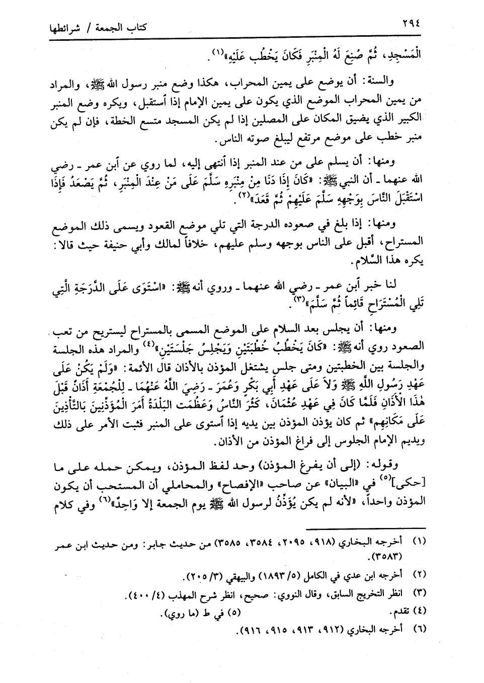 ومنها: أن يسلم على من عند المنبر إذا انتهى إليه، لما روي عن ابن عمر -رضي الله عنهما- أن النبي -صلى الله عليه وسلم-: "كَانَ إِذَا دَنَا مِنْ مِنْبَرِهِ سَلَّمَ عَلَى مَنْ عِنْدَ الْمِنْبَرِ، ثُمَّ يَصْعَدُ فَإذَا اسْتَقْبَل النَّاسَ بِوَجْهِهِ سَلَّمَ عَلَيْهِمْ ثُمَّ قَعَدَ" (¬2).