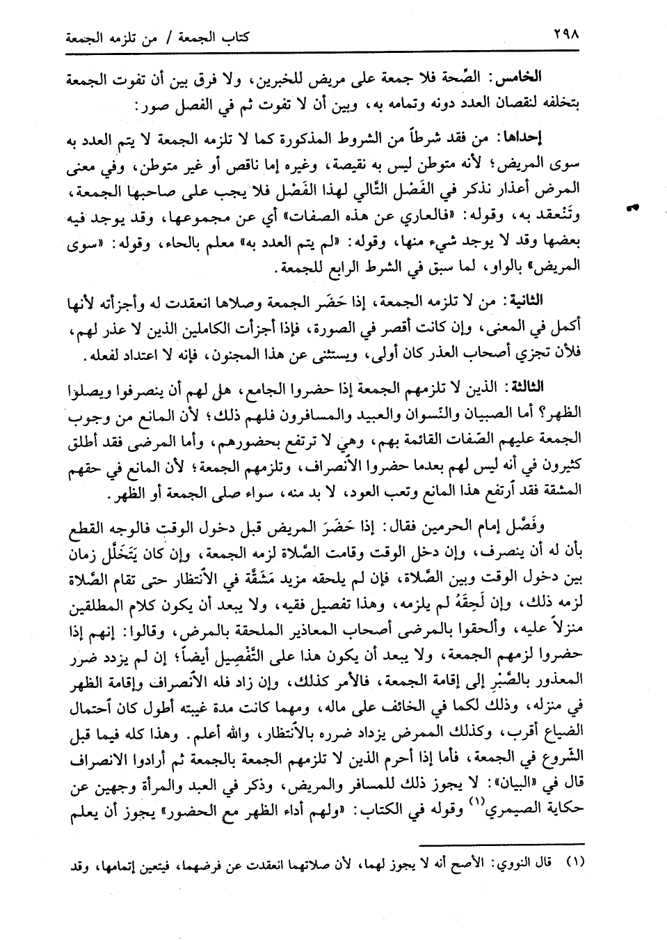 الثالثة: الدين لا تلزمهم الجمعة إذا حضروا الجامع، هل لهم أن ينصرفوا ويصلؤا الظهر؟ أما الصبيان والنّسوان والعبيد والمسافرون فلهم ذلك؛ لأن المانع من وجوب الجمعة عليهم الصّفات القائمة بهم، وهي لا ترتفع بحضورهم، وأما المرضى فقد أطلق كثيرون في أنه ليس لهم بعدما حضروا الانصراف، وتلزمهم الجمعة؛ لأن المانع في حقهم المشقة فقد ارتفع هذا المانع وتعب العود، لا بد منه، سواء صلى الجمعة أو الظهر.