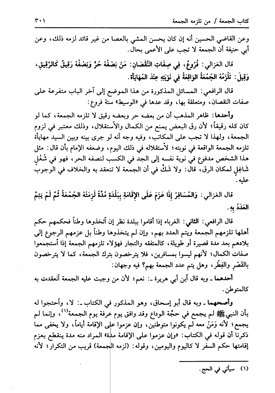 قال الغزالي: فُرُوعٌ، فِي صِفَاتِ النُّقْصَانِ: مَنْ نِصْفُهُ حُرٌّ وَنصْفُهُ رَقِيقٌ كَالرَّقِيقِ، وَقِيلَ: تَلْزَمُهُ الجُمُعَةُ الوَاقعَةُ فِي نَوْبَتِهِ عِنْدَ المُهَايَأة.