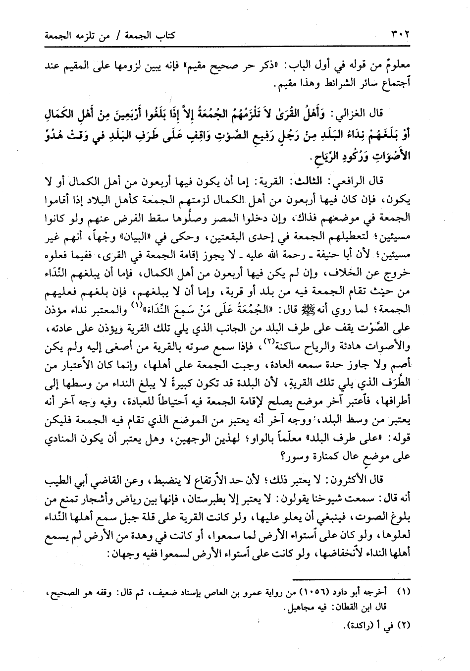 قال الغزالي: وَأَهْلُ القُرَى لاَ تَلْزَمُهُمُ الجُمُعَةُ إلاَّ إِذَا بَلَغُوا أَرْبَعِينَ مِنْ أَهْلِ الكَمَالِ أو بَلَغَهُمْ نِدَاءُ البَلَدِ مِنْ رَجُلٍ رَفِيعِ الصَّوْتِ وَاقِفٍ عَلَى طَرَفِ البَلَدِ في وَقتْ هُدُوِّ الأَصْوَاتِ وَرُكُودِ الرِّيَاحِ.