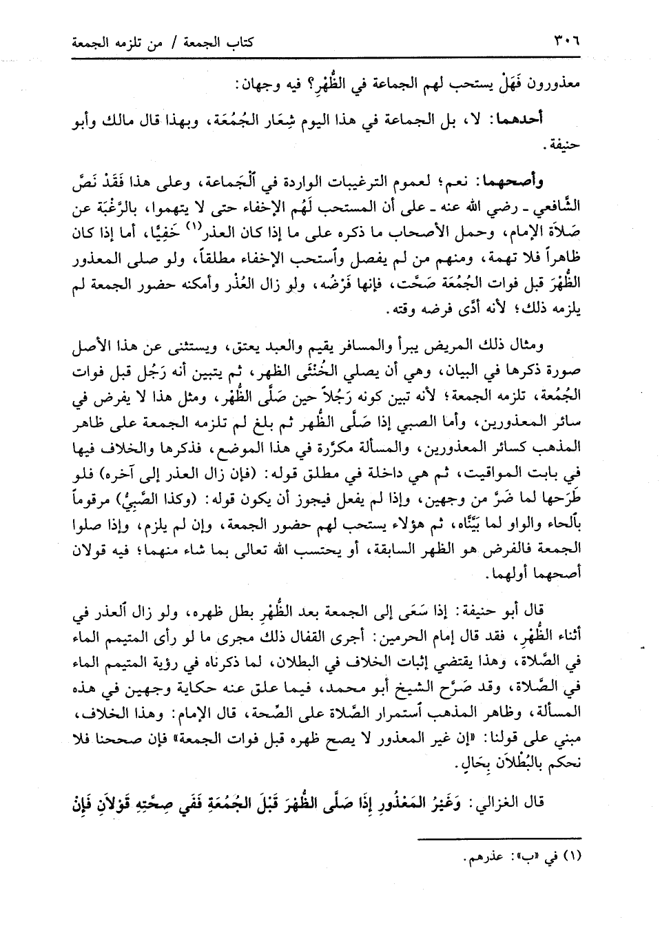 ومثال ذلك المريض يبرأ والمسافر يقيم والعبد يعتق، ويستثنى عن هذا الأصل صورة ذكرها في البيان، وهي أن يصلي الخُنْثَى الظهر، ثم يتبين أنه رَجُل قبل فوات الجُمُعة، تلزمه الجمعة؛ لأنه تبين كونه رَجُلاً حين صَلَّى الظُّهر، ومثل هذا لا يفرض في سائر المعذورين، وأما الصبي إذا صَلَّى الظُّهر ثم بلغ لم تلزمه الجمعة على ظاهر المذهب كسائر المعذورين، والمسألة مكرَّرة في هذا الموضع، فذكرها والخلاف فيها في بابت المواقيت، ثم هي داخلة في مطلق قوله: (فإن زال العذر إلى آخره) فلو طَرَحها لما ضَرَّ من وجهين، وإذا لم يفعل فيجوز أن يكون قوله: (وكذا الصَّبِيُّ) مرقوماً بالحاء والواو لما بَيَّنَّاه، ثم هؤلاء يستحب لهم حضور الجمعة، وإن لم يلزم، وإذا صلوا الجمعة فالفرض هو الظهر السابقة، أو يحتسب الله تعالى بما شاء منهما؛ فيه قولان أصحهما أولهما.