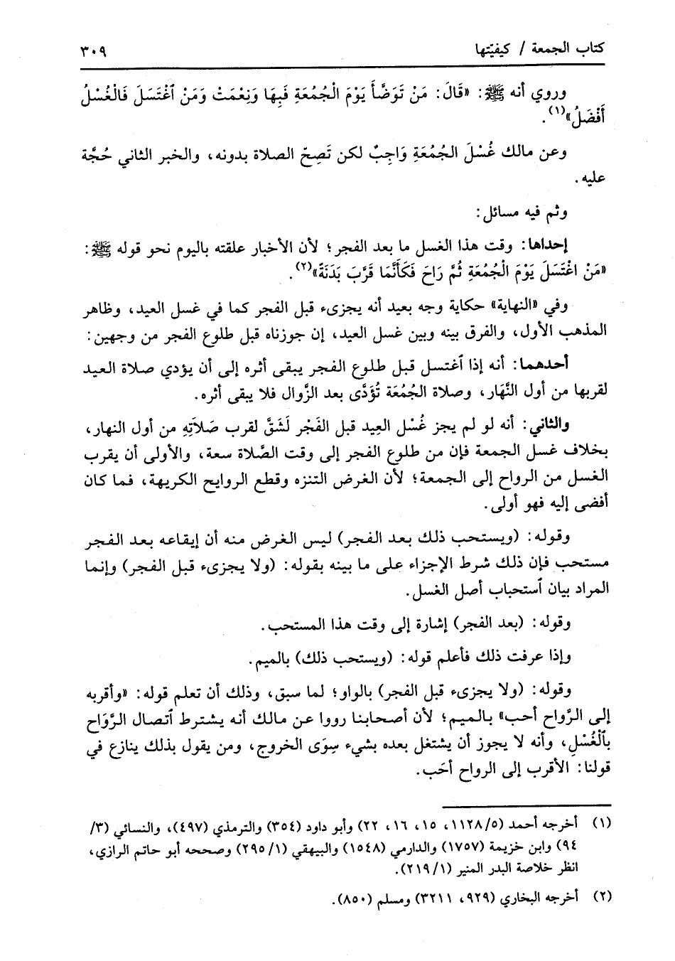 وقوله: (ولا يجزئ قبل الفجر) بالواو؛ لما سبق، وذلك أن تعلم قوله: "وأقربه إلى الرَّواح أحب" بالميم؛ لأن أصحابنا رووا عن مالك أنه يشترط اتصال الرَّوَاح بالْغُسْلِ، وأنه لا يجوز أن يشتغل بعده بشيء سِوَى الخروج، ومن يقول بذلك ينازع في قولنا: الأقرب إلى الرواح أْحَب.