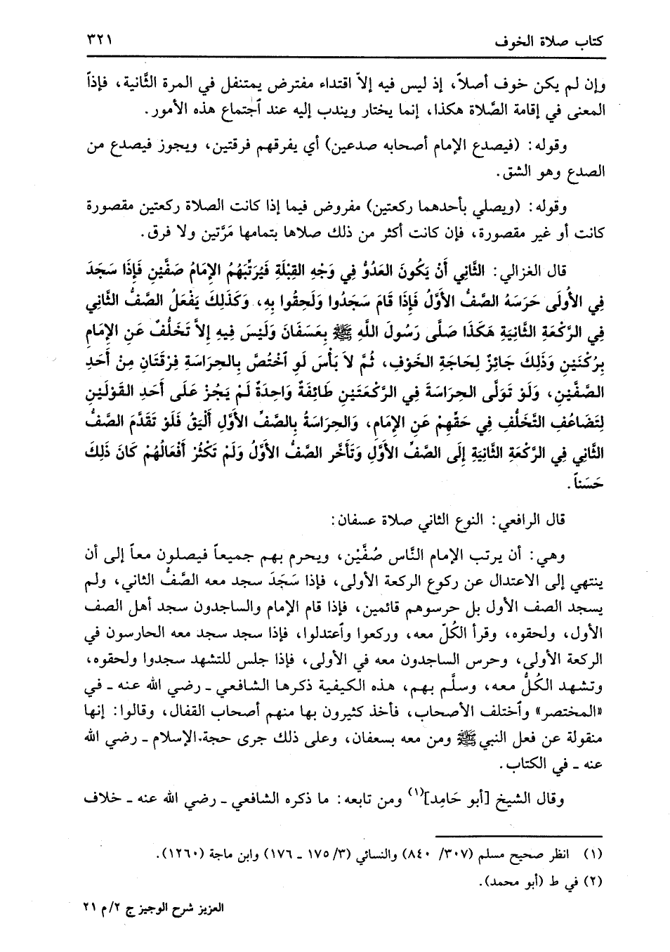 قال الغزالي: الثَّانِي أَنْ يَكُونَ العَدُوْ فِي وَجْهِ القِبْلَةِ فَيُرَتِّبَهُمُ الإِمَامُ صَفَّيْنِ فَإِذَا سَجَدَ فِي الأُولَى حَرَسَهُ الصَّفُّ الأَوَّلُ فَإِذَا قَامَ سَجَدُوا وَلَحِقُوا بِهِ، وَكَذَلِكَ يَفْعَلُ الصَّفُّ الثَّانِي فِي الرَّكْعَةِ الثَّانِيَةِ هَكَذَا صَلَّى رَسُولَ اللهِ -صلى الله عليه وسلم- بِعَسَفَانَ وَلَيْسَ فِيهِ إِلاَّ تَخَلُّفٌ عَنِ الإِمَامِ بِرُكْنَيْنِ وَذَلِكَ جَائِزٌ لِحَاجَةِ الخَوْفٍ، ثُمَّ لاَ بَأْسَ لَوِ اخْتُصَّ بِالحِرَاسَةِ فِرْقَتَانِ مِنْ أَحَدِ الصَّفَّيْنِ، وَلَو تَوَلَّى الحِرَاسَةَ فِي الرَّكْعَتَيْنِ طَائِفَةٌ وَاحِدَةٌ لَمْ يَجُزْ عَلَى أَحَدِ القَوْلَيْنِ لِتَضَاعُفِ التَّخَلُّفِ فِي حَقِّهِمْ عَنِ الإمَامِ، وَالحِرَاسَةُ بالصَّفِّ الأَوَّلِ أَلْيَقُ فَلَوْ تَقَدَّمَ الصَّفُّ الثَّانِي فِي الرَّكْعَةِ الثَّانِيَةِ إِلَى الصَّفِّ الأَوَّلِ وَتَأَخَّر الصَّفُّ الأَوَّلُ وَلَمْ تَكْثُرْ أَفْعَالُهُمْ كَانَ ذَلِكَ حَسَناً.