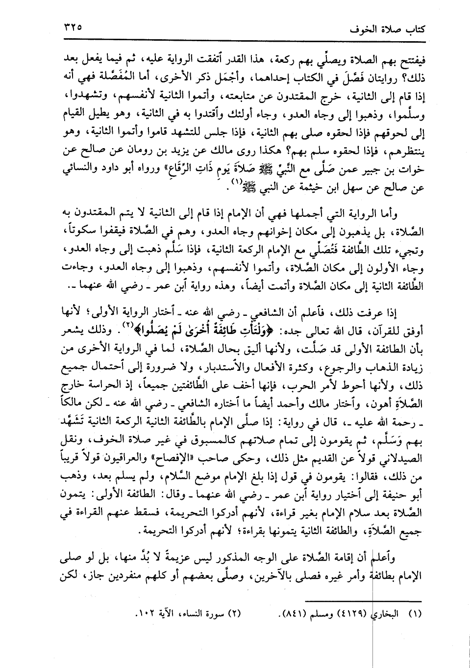 فيفتتح بهم الصلاة ويصلِّي بهم ركعة، هذا القدر اتفقت الرواية عليه، ثم فيما يفعل بعد ذلك؟ روايتان فَصَّلَ في الكتاب إحداهما، وأجْمَل ذكر الأخرى، أما المُفَصَّلة فهي أنه إذا قام إلى الثانية، خرج المقتدون عن متابعته، وأتموا الثانية لأْنفسهم، وتشهدوا، وسلَّموا، وذهبوا إلى وجاه العدو، وجاء أولئك واقتدوا به في الثانية، وهو يطيل القيام إلى لحوقهم فإذا لحقوه صلى بهم الثانية، فإذا جلس للتشهد قاموا وأتموا الثانية، وهو ينتظرهم، فإذا لحقوه سلم بهم؟ هكذا روى مالك عن يزيد بن رومان عن صالح عن خوات بن جبير عمن صَلَّى مع النَّبيِّ -صلى الله عليه وسلم- صَلاةَ يَومِ ذَاتِ الرِّقَاعِ" ورواه أبو داود والنسائي عن صالح عن سهل ابن خيثمة عن النبي -صلى الله عليه وسلم- (¬1).