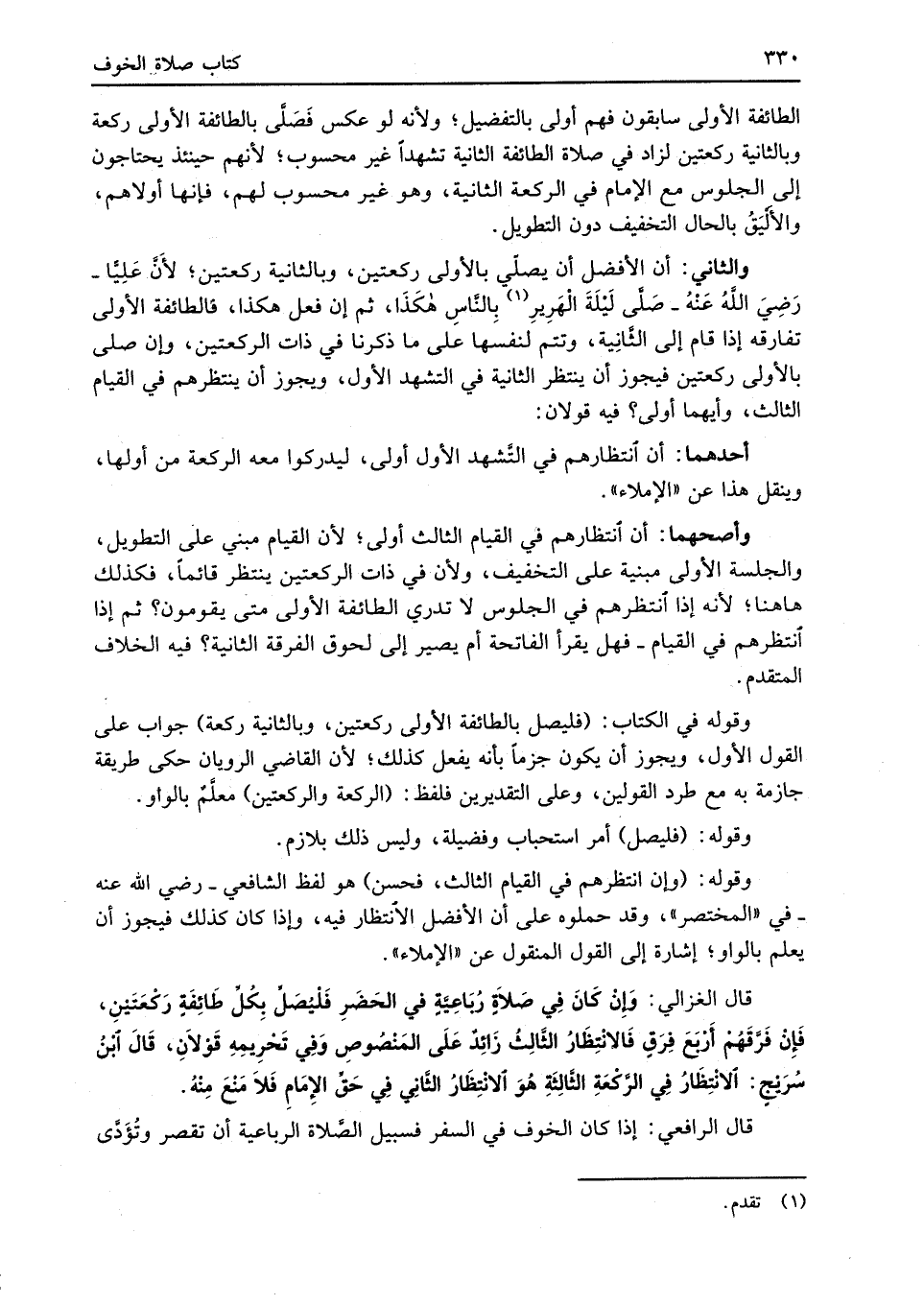 وقوله في الكتاب: (فليصل بالطائفة الأولى ركعتين، وبالثانية ركعة) جواب على القول الأول، ويجوز أن يكون جزماً بأنه يفعل كذلك؛ لأن القاضي الرويان حكى طريقة جازمة به مع طرد القولين، وعلى التقديرين فلفظ: (الركعة والركعتين) معلَّمٌ بالواو.