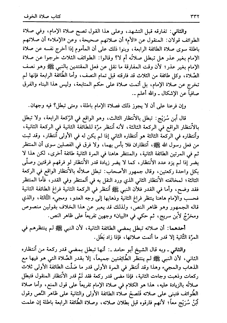 قال ابن سُرَيْج: تبطل بالانتظار الثالث، وهو الواقع في الرَّكعة الرابعة، ولا تبطل بالانتظار الواقع في الركعة الثالثة، لأنه انتظر مرَّة للطائفة الثانية في الركعة الثانية، وانتظاره في الركعة الثالثة هو انتظاره الثاني إذا لم يكن له في الأولى انتظار، وقد ثبت من فعل رسول الله -صلى الله عليه وسلم-، انتظاران فلا بأس بهما، ولا فرق في الفصلين سوى أن المنتظر ثم في المرتين الطائفة الثانية، والمنتظر هاهنا في المرة الثانية طائفة أخرى، لكن هذا لا يضر إذا لم يزد عدد الانتظار، كما لا يضر زيادة قدر الانتظار لو فرقهم فرقتين وصلَّى بكل واحدة ركعتين، وقال جمهور الأصحاب: تبطل صلاتُه بالانتظار الواقع في الركعة الثالثة؛ لمخالفته الانتظار الثاني الذي ورد النقل به في المنتظر وفي القدر، فأما المنتظر فقد وضح، وأما في القدر فلأن النبي -صلى الله عليه وسلم- انتظر في الركعة الثانية فراغ الطائفة الثانية فحسب والإمام هاهنا ينتظر فراغ الثانية وذهابها إلى وجه العدو، ومجيء الثَّالثة، والذي قاله الجمهور وهو ظاهر النص، ولذلك قد يعبر عن هذا الخلاف بقولين منصوص ومخرَّجٌ لابن سريج، ثم حكي في "البيان" وجهين تفريعاً على ظاهر النص.
