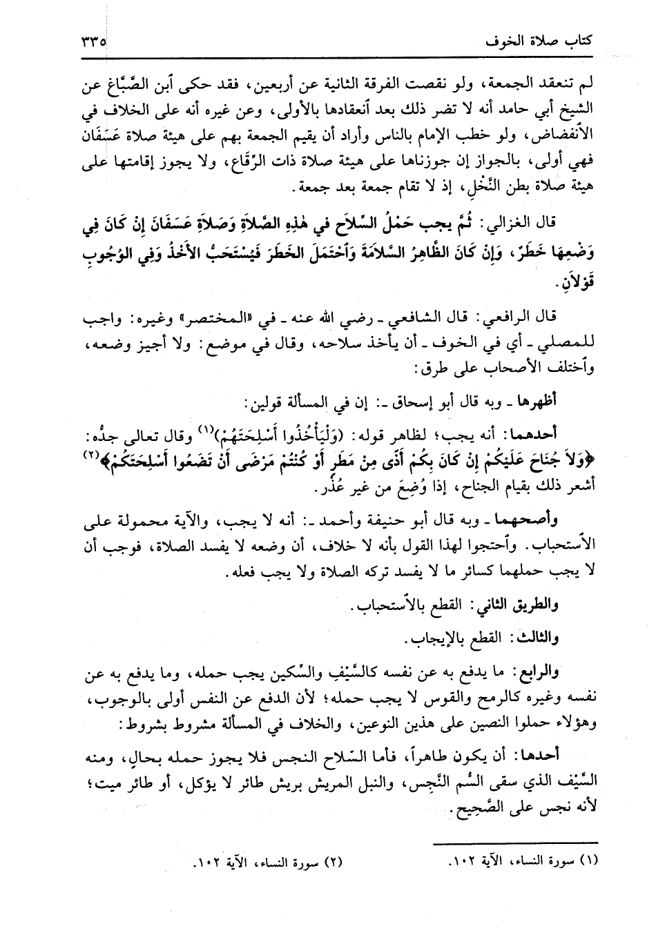 قال الغزالي: ثمَّ يجب حَمْلُ السِّلاحَ في هذِهِ الصَّلاَةِ وَصَلاة عَسَفَانَ إنْ كَانَ فِي وَضْعِهَا خَطَرٌ، وَإِنْ كَانَ الظَّاهِرُ السَّلاَمَةَ وَاحْتَمَلَ الخَطَرَ فَيُسْتَحَبُّ الأخْذُ وَفِي الوُجُوبِ قَوْلاَنِ.