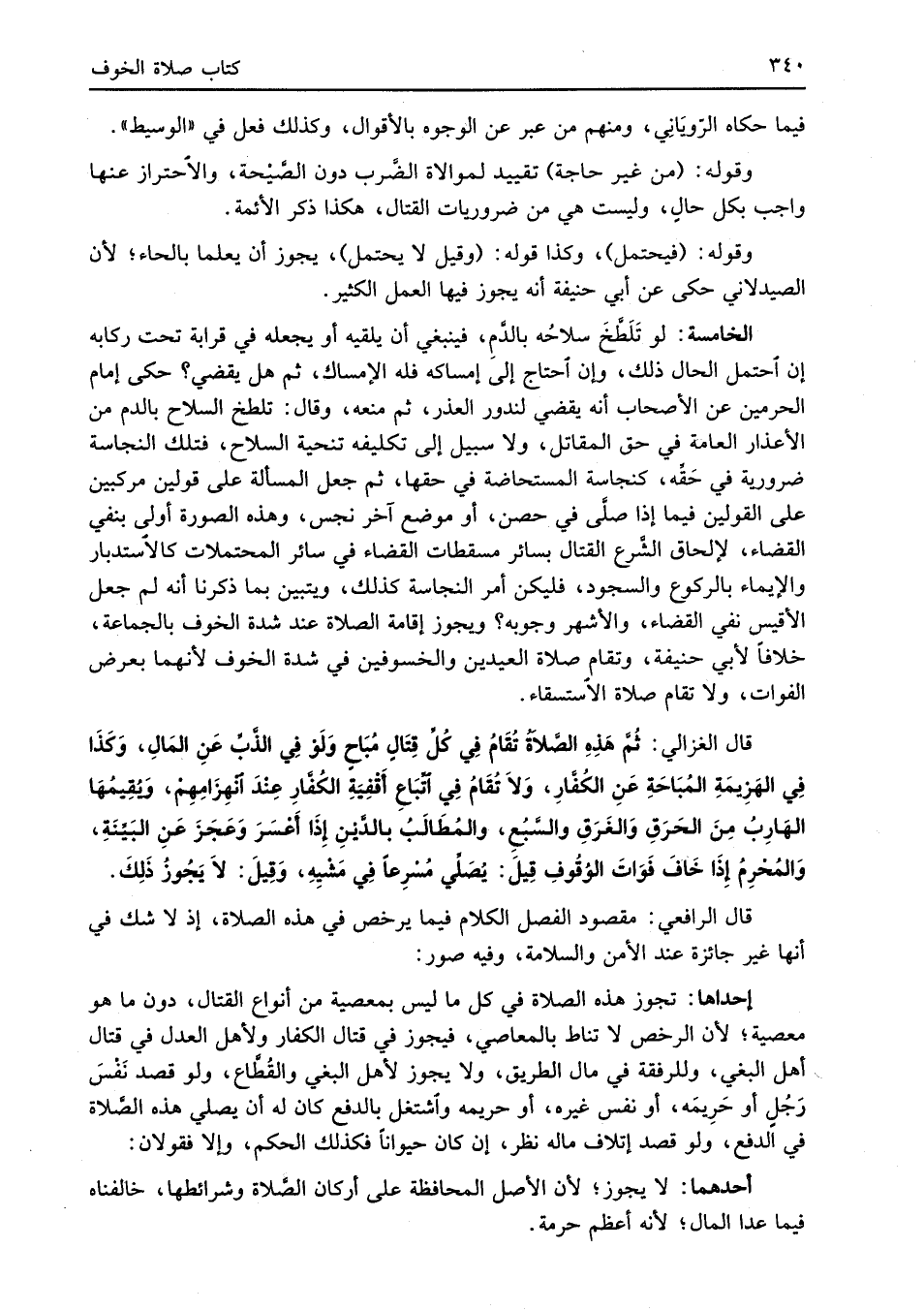 قال الغزالي: ثُمَّ هَذِهِ الصَّلاةُ تُقَامُ فِي كُلِّ قِتَال مُبَاحٍ وَلَو فِي الذَّبِّ عَنِ المَالِ، وَكَذَا فِي الهَزِيمَةِ المُبَاحَةِ عَنِ الكُفَّارِ، وَلاَ تُقَامُ فِي اتِّبَاعِ أَقْفِيَةِ الكُفَّارِ عِنْدَ انْهِزَامِهِمْ، وَيُقِيمُهَا الهَارِبُ مِنَ الحَرَقِ وَالغَرَقِ والسَّبُعِ، والمُطَالَبُ بالدَّيْنِ إِذَا أَعسَرَ وَعَجَزَ عَنِ البَيِّنَةِ، وَالمُحْرِم إِذَا خَافَ فَوَاتَ الوُقُوفِ قِيلَ: يُصَلِّي مُسْرِعاً فِي مَشْيِهِ، وَقِيلَ: لاَ يَجُوزُ ذَلِكَ.