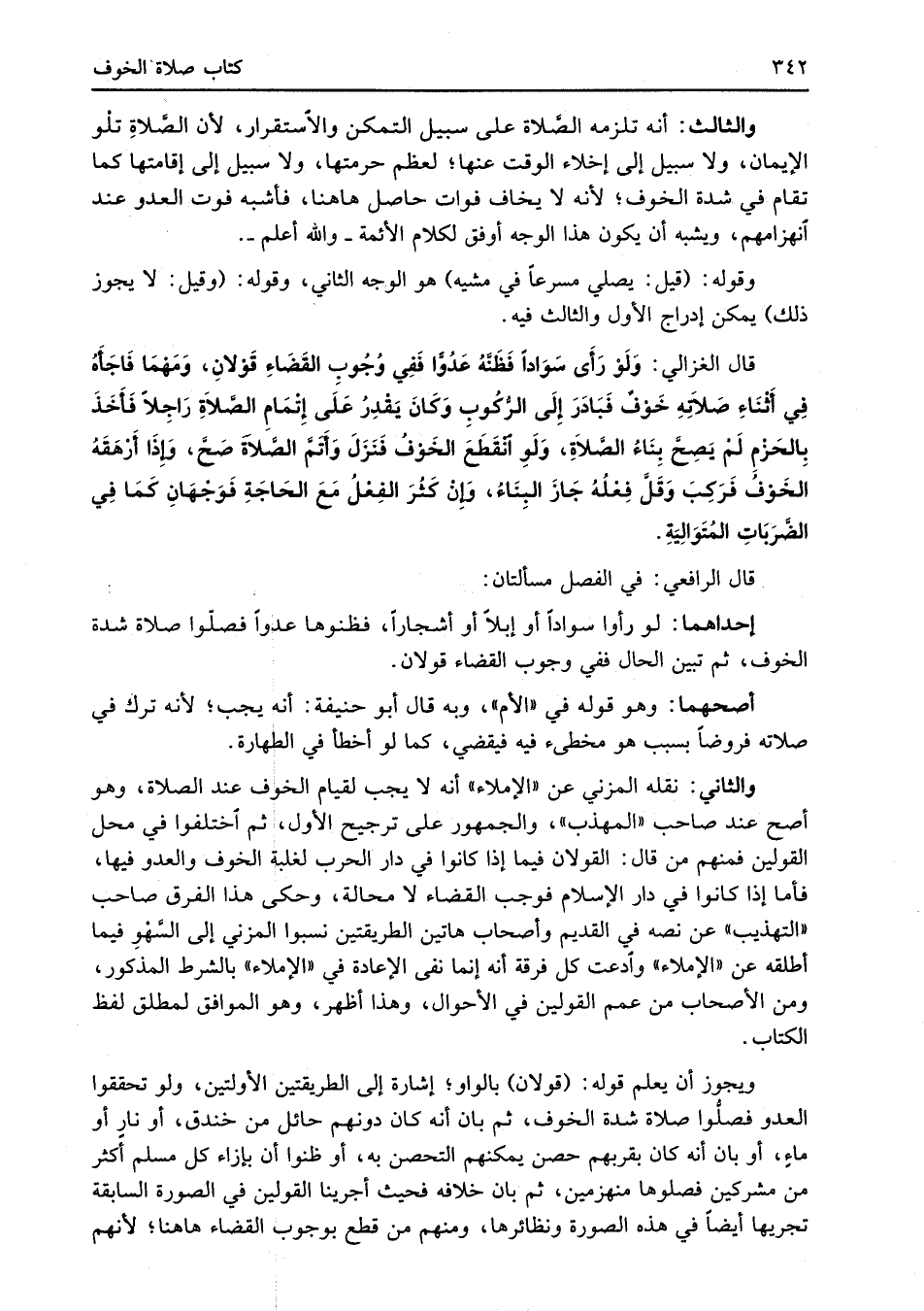 قال الغزالي: وَلَوْ رَأَى سَوَادًا فَظَنَّهُ عَدُوًّا فَفِي وُجُوبِ القَضَاءِ قَوْلانِ، وَمَهْمَا فَاجَأَهُ فِي أَثْنَاءِ صَلاِتهِ خَوْفٌ فَبَادَرَ إِلَى الرُّكُوبِ وَكَانَ يَقْدِرُ عَلَى إِتْمَامِ الصَّلاَةِ رَاجِلاً فَأَخَذَ بِالحَزْمِ لَمْ يَصِحَّ بِنَاءُ الصَّلاَةِ، وَلَوِ انْقَطَعَ الخَوْفُ فَنَزَلَ وَأَتَمَّ الصَّلاةَ صَحَّ، وَإِذَا أَرْهَقَهُ الخَوْفُ فَرَكبَ وَقَلَّ فِعْلُهُ جَازَ البِنَاءُ، وَإِنْ كَثُرَ الفِعْلُ مَعَ الحَاجَةِ فَوَجْهَانِ كَمَا فِي الضَّرَبَاتِ المُتَوَالِيَةِ.