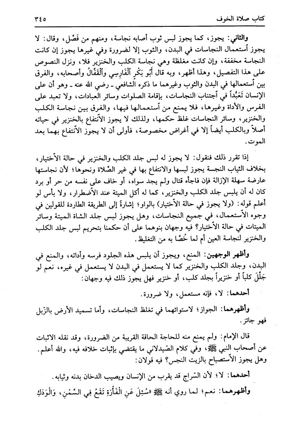 والثاني: يجوز، كما يجوز لبس ثوب أصابه نجاسة، ومنهم من فَصَّل، وقال: لا يجوز استعمال النجاسات في البدن، والثوب إلا لضرورة وفي غيرها يجوز إن كانت النجاسة مخففة، وإن كانت مغلظة وهي نجاسة الكلب والخنزير فلا، ونزل النصوص على هذا التفصيل، وهذا أظهر، وبه قال اْبُو بَكْرٍ الفَارِسِي والْقَفَّالُ وأصحابه، والفرق بين استعمالها في البدن والثوب وغيرهما ما ذكره الشافعي -رضي الله عنه- وهو أن على الإنسان تَعَبُّداً في اجتناب النجاسات، بإقامة الصلوات وسائر العبادات، ولا تعبد على الفرس والأداة وغيرها، فلا يمنع من استعمالها فيها، والفرق بين نجاسة الكلب والخنزير، وسائر النجاسات غلظ حكمها، ولذلك لا يجوز الانتفاع بالخنزير في حياته أصلاً وبالكلب أيضاً إلا في أغراض مخصوصة، فأولى أن لا يجوز الانتفاع بهما بعد الموت.
