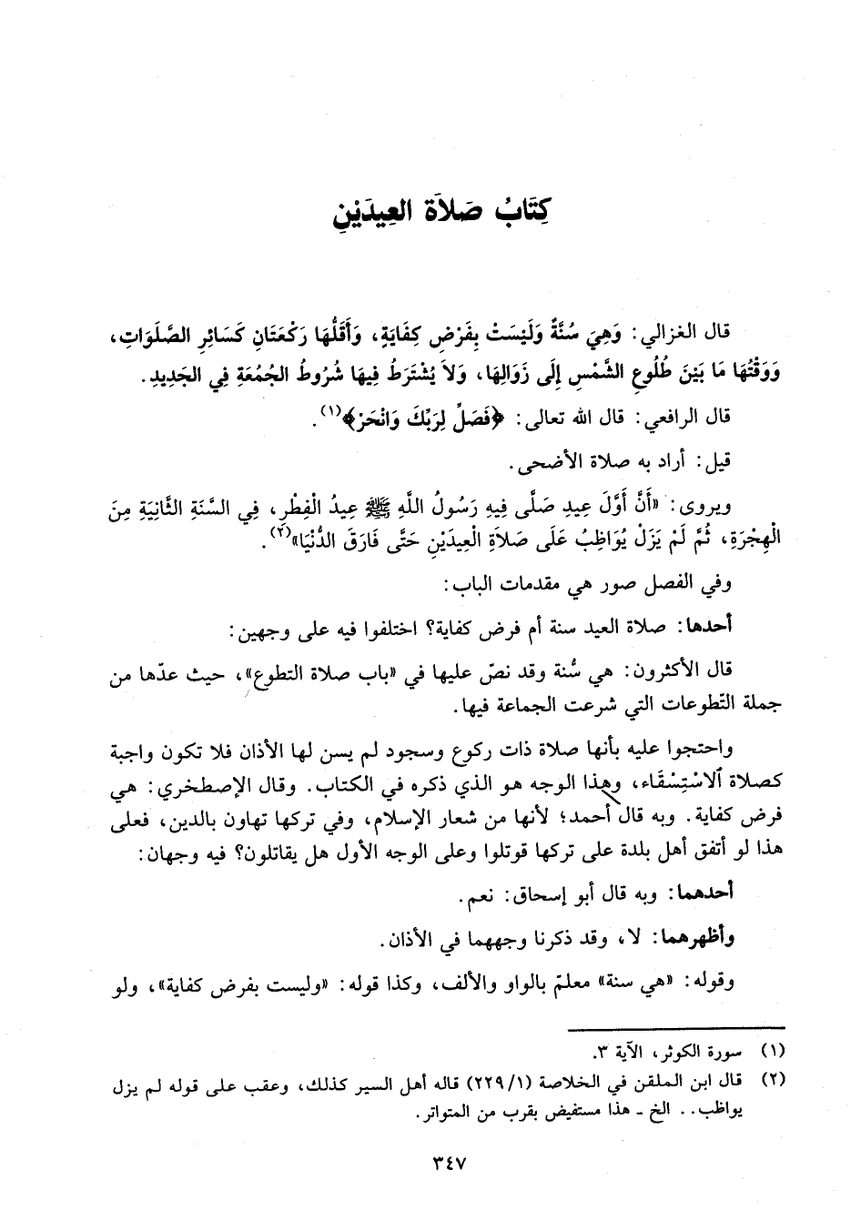 قال الرافعي: قال الله تعالى: {فَصَلِّ لِرَبِّكَ وَانْحَرْ} (¬1).
