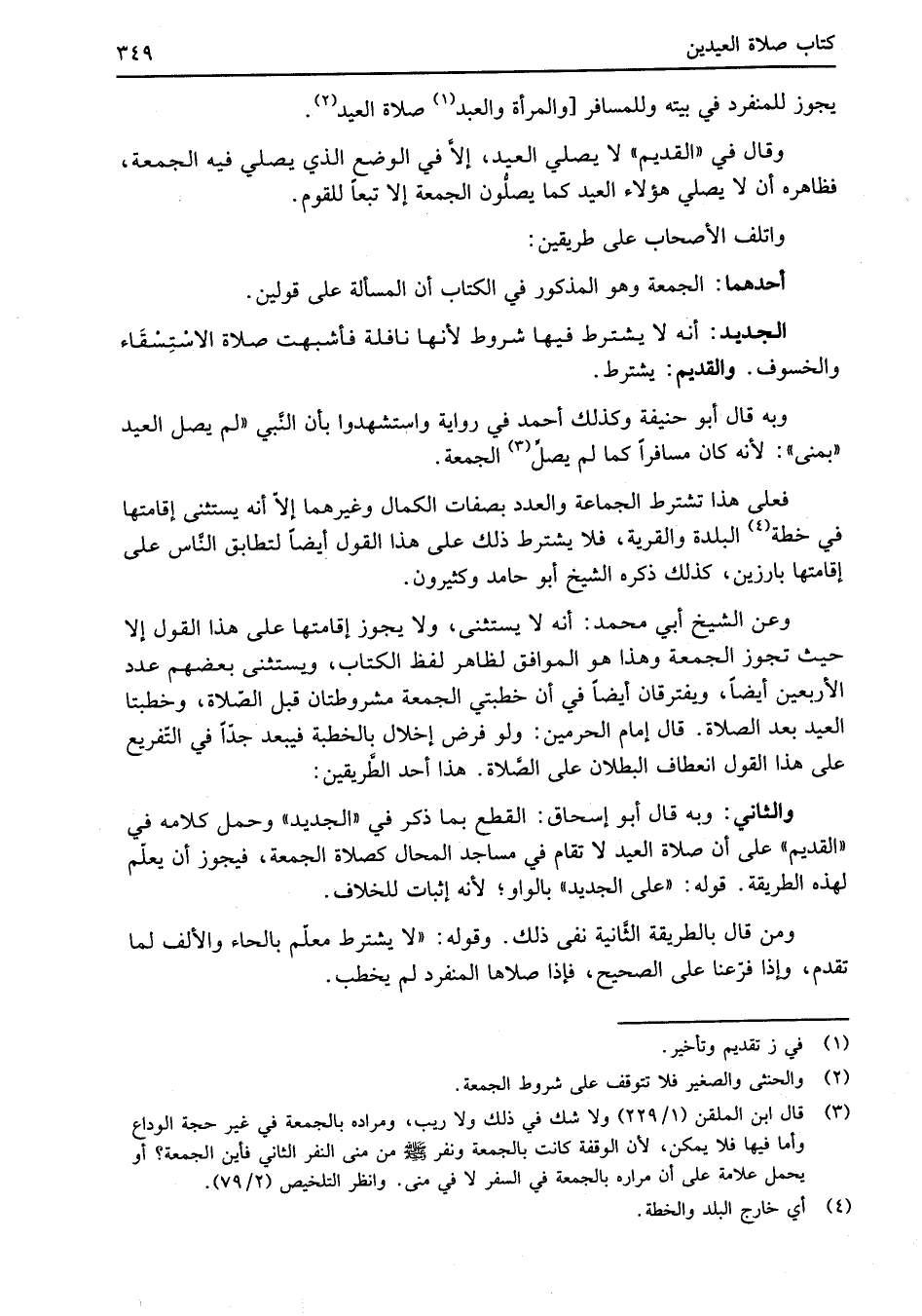 وبه قال أبو حنيفة وكذلك أحمد في رواية واستشهدوا بأن النَّبي "لم يصل العيد "بمنى": لأنه كان مسافراً كما لم يصلِّ (¬3) الجمعة.