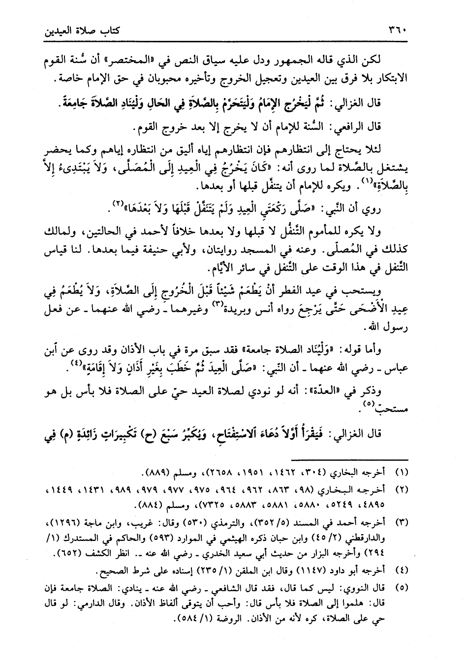 روي أن النَّبي: "صَلَّى رَكْعَتَيِ الْعِيدِ وَلَمْ يَتَنَفَّلْ قَبْلَهَا وَلاَ بَعْدَهَا" (¬2).