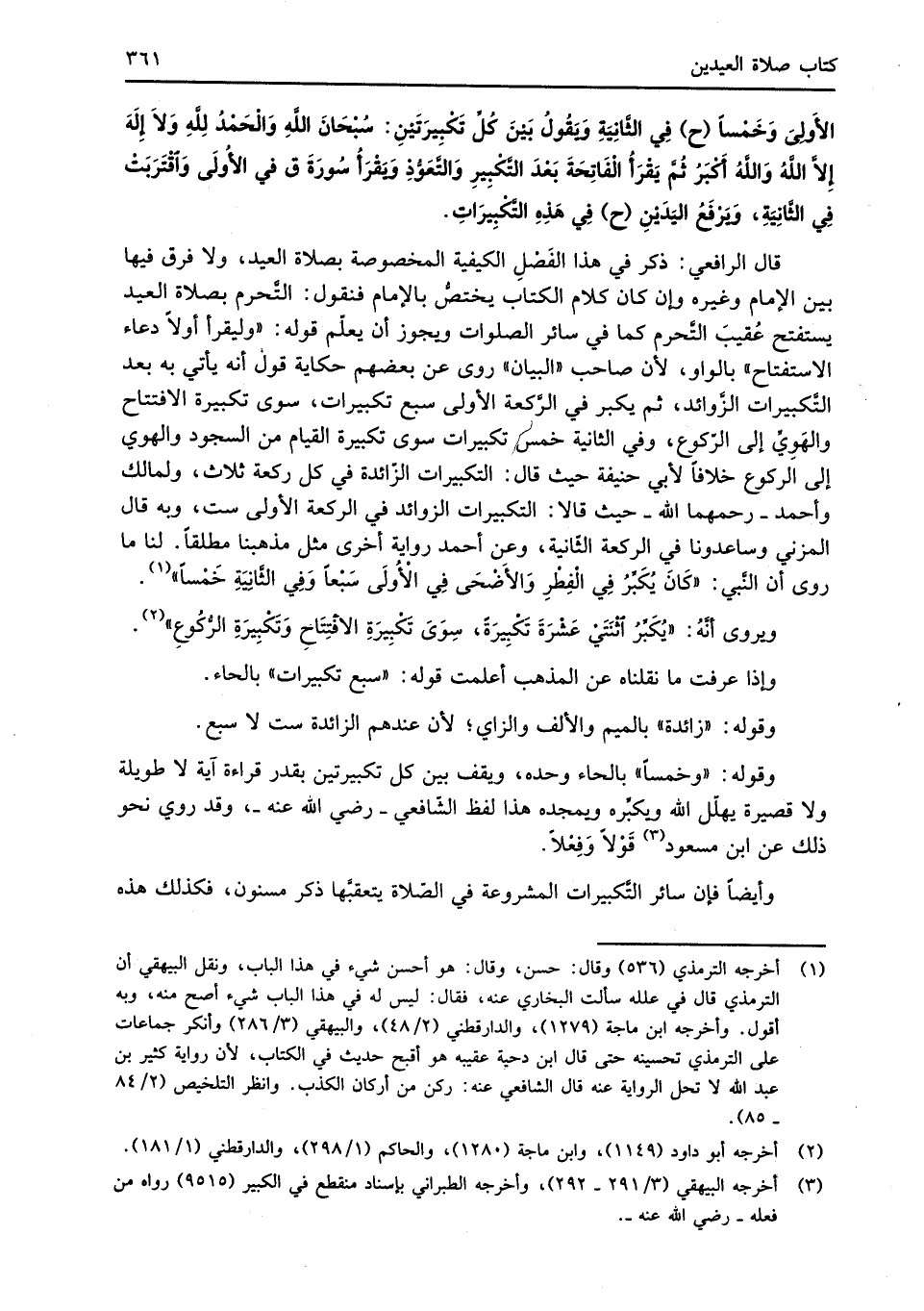 قال الرافعي: ذكر في هذا الفَصْلِ الكيفية المخصوصة بصلاة العيد، ولا فرق فيها بين الإمام وغيره وإن كان كلام الكتاب يختصُّ بالإمام فنقول: التَّحرم بصلاة العيد يستفتح عُقيبَ التَّحرم كما في سائر الصلوات ويجوز أن يعلّم قوله: "وليقرأ أولاً دعاء الاستفتاح" بالواو، لأن صاحب "البيان" روى عن بعضهم حكاية قول أنه يأتي به بعد التَّكبيرات الزَّوائد، ثم يكبر في الرَّكعة الأولى سبع تكبيرات، سوى تكبيرة الافتتاح والهَوِيِّ إلى الرّكوع، وفي الثانية خمس تكبيرات سوى تكبيرة القيام من السجود والهوي إلى الركوع خلافاً لأبي حنيفة حيث قال: التكبيرات الزّائدة في كل ركعة ثلاث، ولمالك وأحمد -رحمهما الله- حيث قالا: التكبيرات الزوائد في الركعة الأولى ست، وبه قال المزني وساعدونا في الركعة الثّانية، وعن أحمد رواية أخرى مثل مذهبنا مطلقاً. لنا ما روى أن النَّبي: "كَانَ يُكَبِّرُ فِي الْفِطْرِ وَالأَضْحَى فِي الْأُولَى سَبْعاً وَفِي الثَّانيَةِ خَمْساً" (¬1).