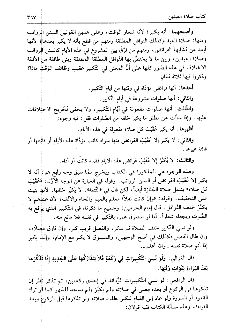 وأصحهما: أنه يكبر؛ لأنه شعار الوقت، وعلى هذين القولين السنن الرواتب ومنها: صلاة العيد وكذلك النوافل المطلقة ومنهم من قطع بأنه لا يكبر بعدها؛ لأنها أبعد عن مُشَابهة الفرائض، ومنهم من فرَّقَ بين المشروع في هذه الأيام كالسنن الرواتب وصلاة العيدين، وبين ما لا يختصُّ بها النَّوافل المطلقة المطلقة وبنى طائفة من الأئمّة الاختلاف في هذه الصّور كلها على أَنَّ المعنى في التَّكبير عقيب وظائف الوَقْتِ ماذا؟ وذكروا فيها ثلاثة مَعَانٍ: