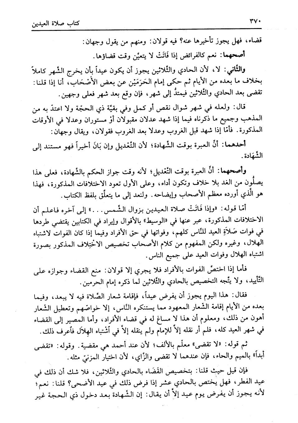 فقال: هذا اليوم يجوز أن يفرض عيداً، فإقامة شعار الصَّلاة فيه لا يبعد، وفيما بعده من الأيام إقامة الشّعار المعهود مما يستنكره النَّاس، إلا خواصّهم وتعطيل الشّعار أهون من ذلك، ومعلوم أن هذا لا مساغ له في قضاء الأفراد، وأما المصير إلى القضاء في شهر العيد كله، فلم أر نقله إلاَّ للإمام ولم ينقله إلاَّ في اشْتباه الهِلاَل فاعرف ذلك.