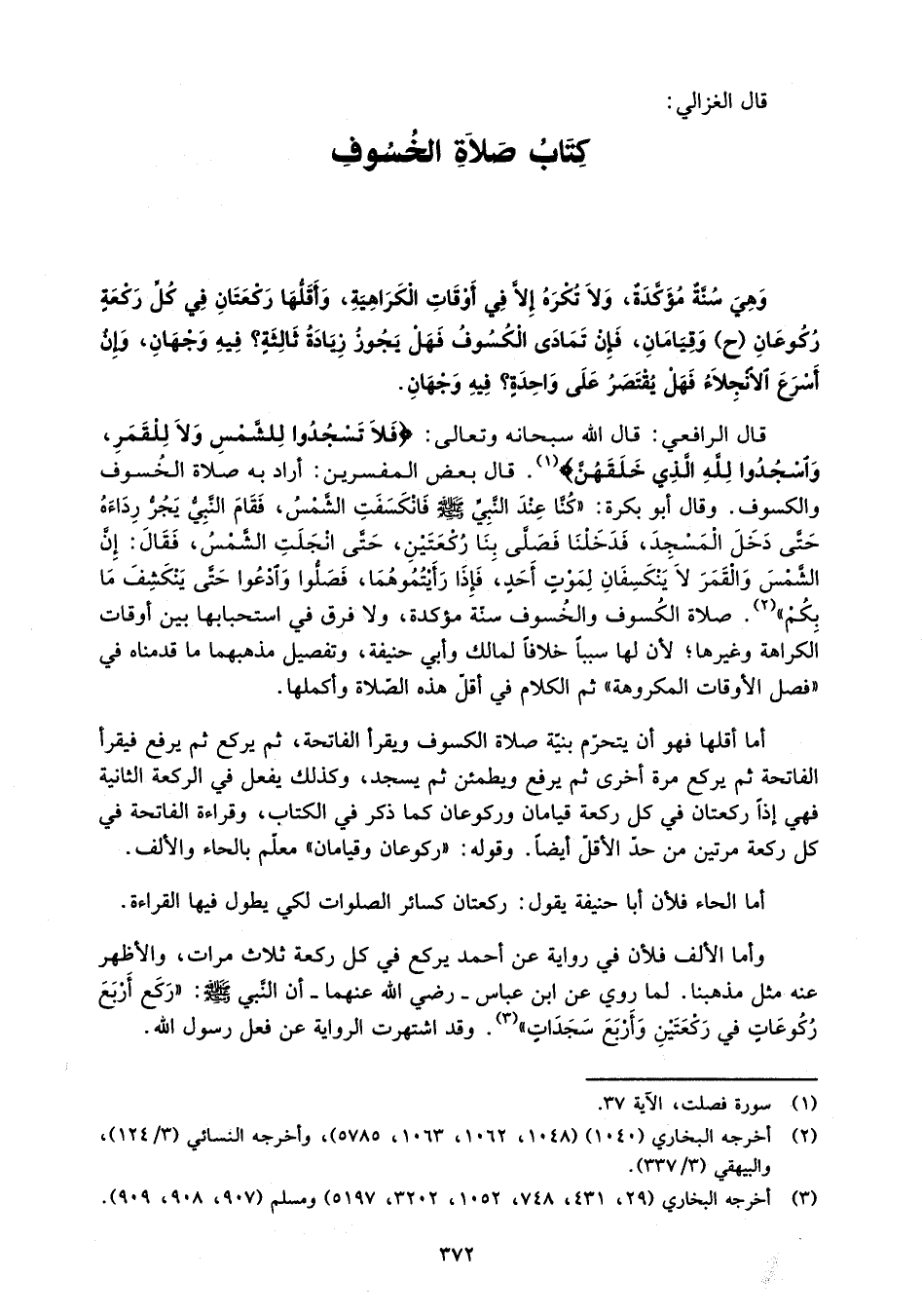 وَهِيَ سُنَّةٌ مُؤَكَّدَةٌ، وَلاَ تُكْرَهُ إلاَّ فِي أَوْقَاتِ الْكَرَاهِيَةِ، وَأَقَلُّهَا رَكْعَتَانِ فِي كُلِّ رَكْعَةٍ رُكُوعَانِ (ح) وَقِيَامَانِ، فَإِنْ تَمَادَى الْكُسُوفُ فَهَلْ يَجُوزُ زَيَادَةُ ثَالِثَةٍ؟ فِيهِ وَجْهَانِ، وَإنْ أَسْرَعَ الانْجِلاَء فَهَلْ يُقْتَصَرُ عَلَى وَاحِدَةٍ؟ فِيهِ وَجْهَانِ.