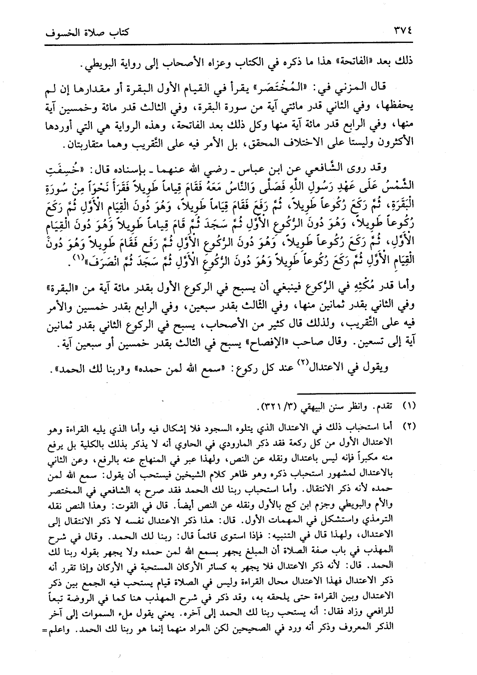 وقد روى الشَّافعي عن ابن عباس -رضي الله عنهما- بإسناده قال: "خُسِفَتِ الشَّمْسُ عَلَى عَهْدِ رَسُولِ اللهِ فَصَلَّى وَالنَّاسُ مَعَهُ فَقَامَ قِياماً طَوِيلاَ فَقَرَأَ نَحْوًا مِنْ سُورَةِ الْبَقَرَةِ، ثُمَّ رَكعَ رُكُوعاً طَوِيلاً، ثُمَّ رَفَعَ فَقَامَ قِيَاماً طَوِيلاً، وَهُوَ دُونَ الْقِيَامِ الأَوَّلِ ثُمَّ رَكَعَ رُكُوعاً طَوِيلاً، وَهُوَ دُونَ الرُّكُوعِ الأوَّلِ ثُمَّ سَجَدَ ثُمَّ قَامَ قِياماً طَوِيلاً وَهُوَ دُونَ الْقِيَامٍ الأَوَّلِ، ثُمَّ رَكَعَ رُكُوعاً طَوِيلاً، وَهُوَ دُونَ الرُّكُوع الْأوَّلِ ثُمَّ رَفَع فَقَامَ طَوِيلاً وَهُوَ دُونَ القِيَامِ الأَوَّلِ ثُمَّ رَكَعَ رُكُوعًا طَوِيلاً وَهُوَ دُونَ الرُّكُوعَ الأَوَّلِ ثُمَّ سَجَدَ ثُمَّ انْصَرَفَ" (¬1).