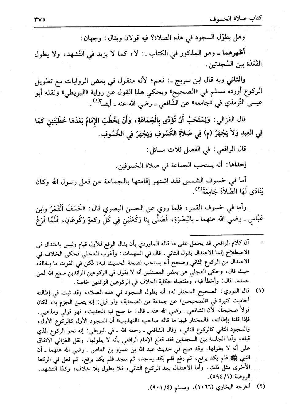 قال الغزالي: وَيُسْتَحبُّ أَنْ تُؤَدَّى بِالْجَمَاعَةِ، وَأَنْ يَخْطُبَ الإِمَامُ بَعْدَهَا خُطْبَتَيْنِ كَمَا فِي العِيدِ وَلاَ يَجْهَرُ (م) فِي صَلاة الكُسُوفِ وَيَجْهَرُ فِي الخُسُوفِ.