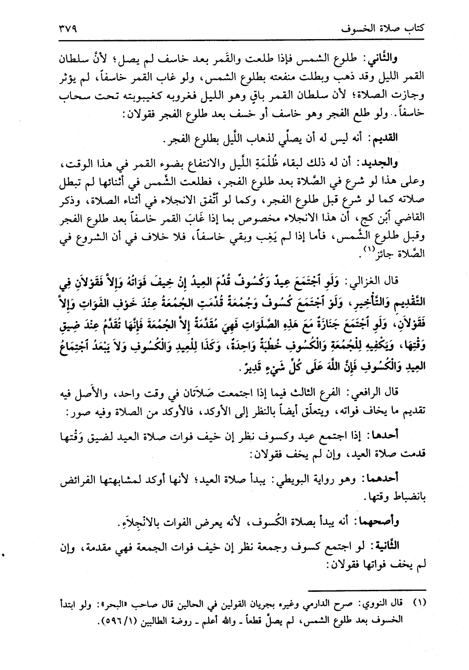 (¬1) قال النووي: صرح الدارمي وغيره بجريان القولين في الحالين قال صاحب "البحر": ولو ابتدأ الخسوف بعد طلوع الشمس، لم يصل قطعاً -والله أعلم- روضة الطالبين (1/ 596).