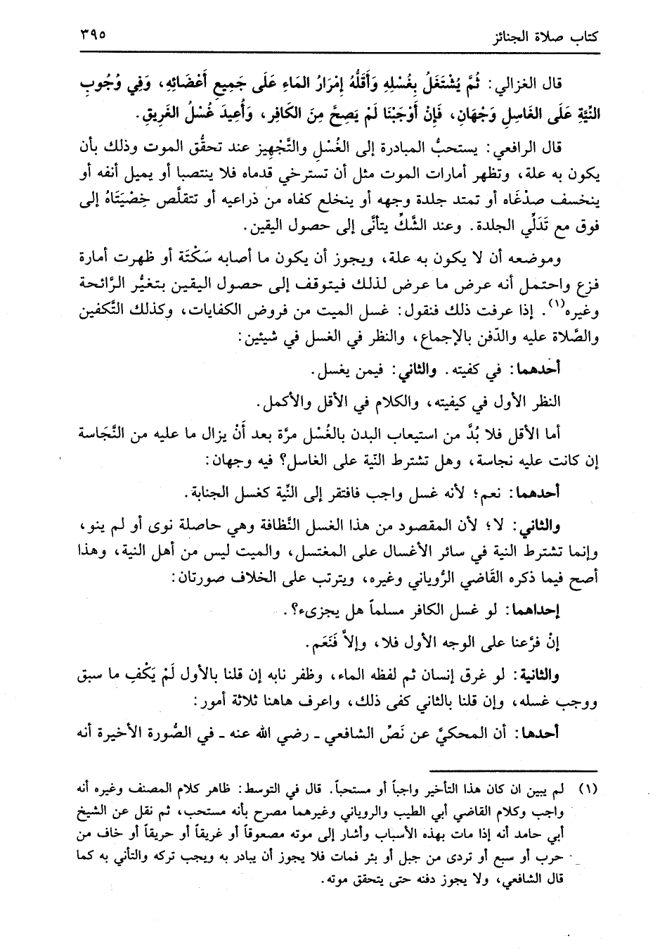 قال الغزالي: ثُمَّ يُشْتَغَلُ بِغُسْلِهِ وَأَقَلُّهُ إِمْرَارُ المَاءِ عَلَى جَمِيعِ أَعْضَائهِ، وَفِي وُجُوبِ النِّيَّةِ عَلَى الغَاسِلِ وَجْهَانِ، فَإِنْ أَوْجَبْنَا لَمْ يَصِحَّ مِنَ الكَافِر، وَأُعِيدَ غُسْلُ الغَرِيقِ.