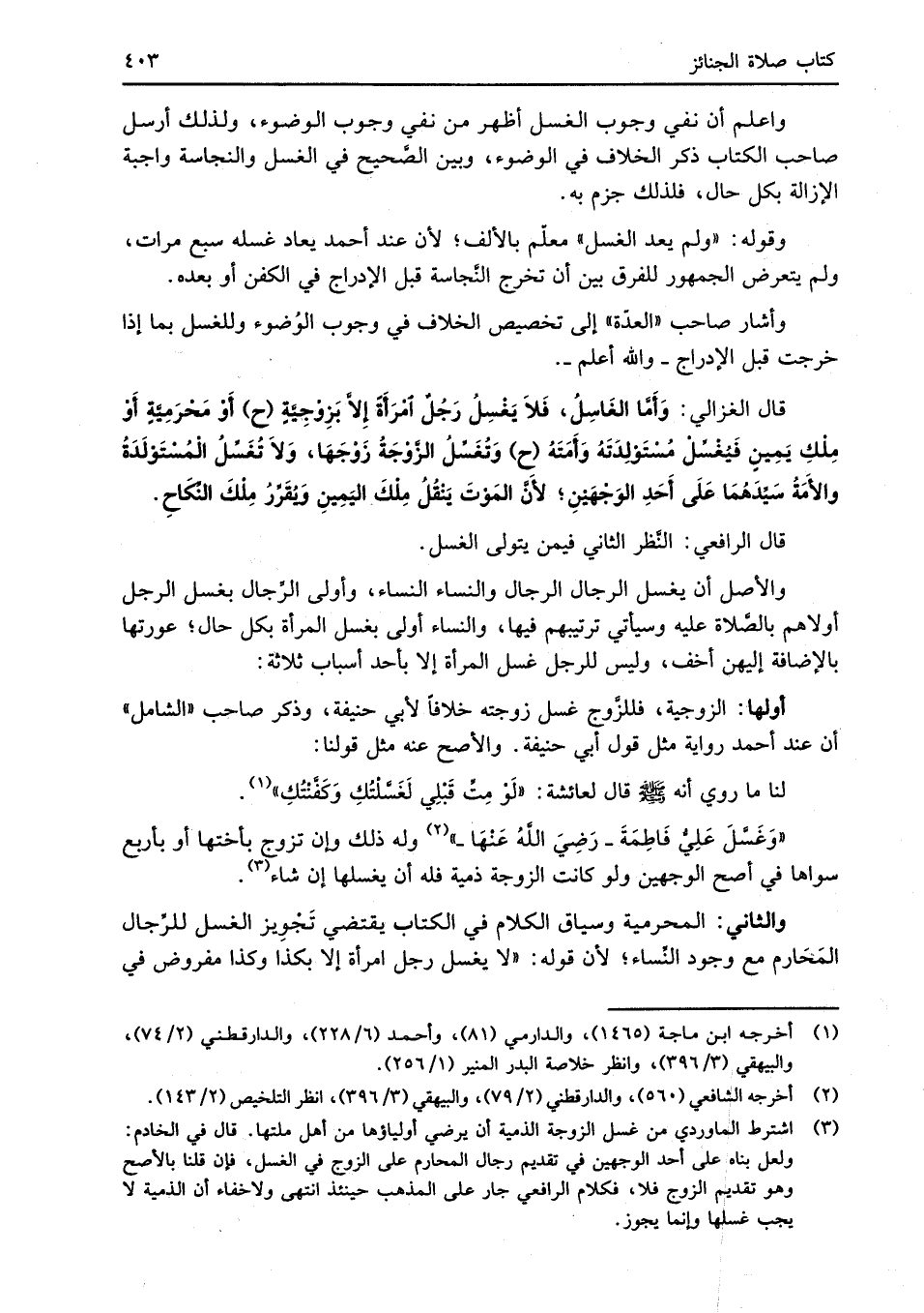 (¬3) اشترط الماوردي من غسل الزوجة الذمية أن يرضي أولياؤها من أهل ملتها. قال في الخادم: ولعل بناه على أحد الوجهين في تقديم رجال المحارم على الزوج في الغسل، فإن قلنا بالأصح وهو تقديم الزوج فلا، فكلام الرافعي جار على المذهب حينئذ انتهى ولاخفاء أن الذمية لا يجب غسلها وإنما يجوز.