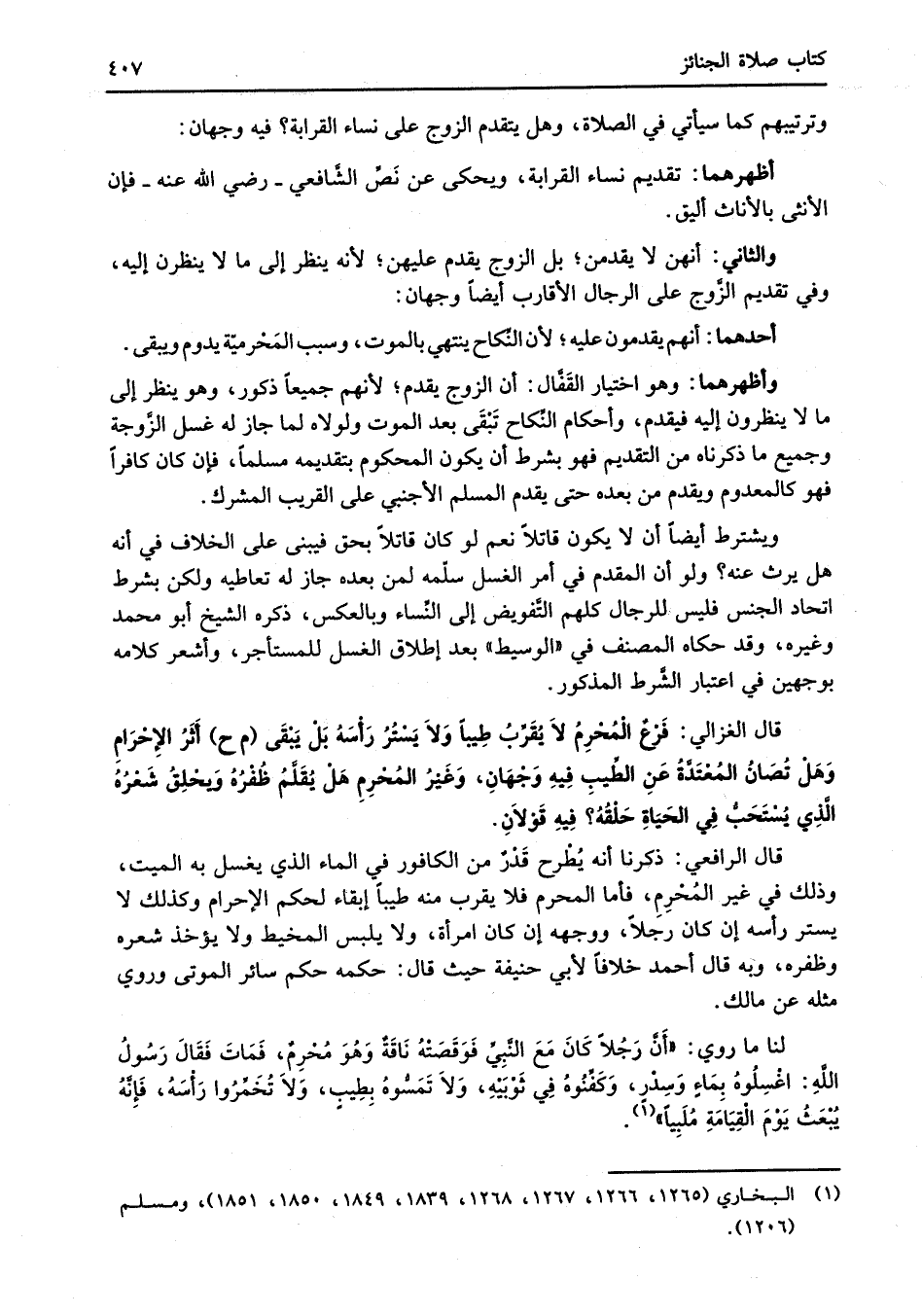قال الغزالي: فَرْعٌ المُحْرِمُ لاَ يُقَرِّبُ طِيباً وَلاَ يَسْتُرُ رَأْسَهُ بَلْ يَبْقَى (م ح) أَثَرُ الإحْرَامِ وَهَل تُصَانُ المُعتَدَّةُ عَنِ الطِّيبِ فِيهِ وَجْهَانِ، وَغَيْرُ المُحْرِمِ هَلْ يُقَلَّمُ ظُفْرُهُ وَيحْلِقُ شَعْرُهُ الَّذِي يُسْتَحَبُّ فِي الحَيَاةِ حَلْقُهُ؟ فِيهِ قَوْلاَنِ.