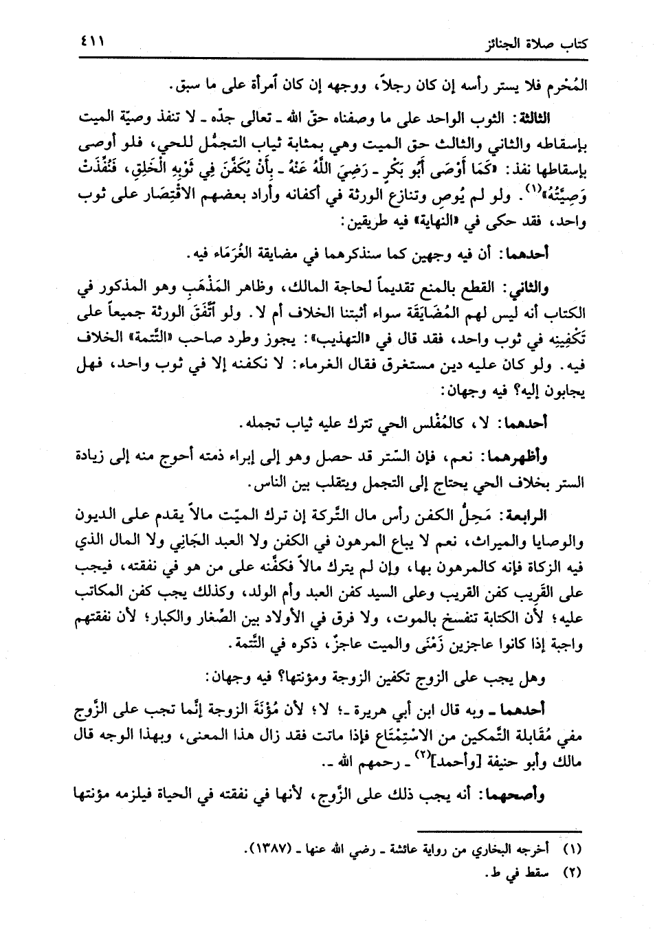 الثالثة: الثوب الواحد على ما وصفناه حقّ الله -تعالى جدّه- لا تنفذ وصيّة الميت بإسقاطه والثاني والثالث حق الميت وهي بمثابة ثياب التجمُّل للحي، فلو أوصى بإسقاطها نفذ: "كمَا أَوْصَى أبُو بَكرٍ -رَضِيَ الله عَنْهُ- بِأَنْ يُكَفَّنَ فِي ثَوْبِهِ الْخَلِقِ، فَنُفِّذَتْ وَصِيَّتُهُ" (¬1). ولو لم يُوصِ وتنازع الورثة في أكفانه وأراد بعضهم الاقْتِصَار على ثوب واحد، فقد حكى في "النهاية" فيه طريقين: