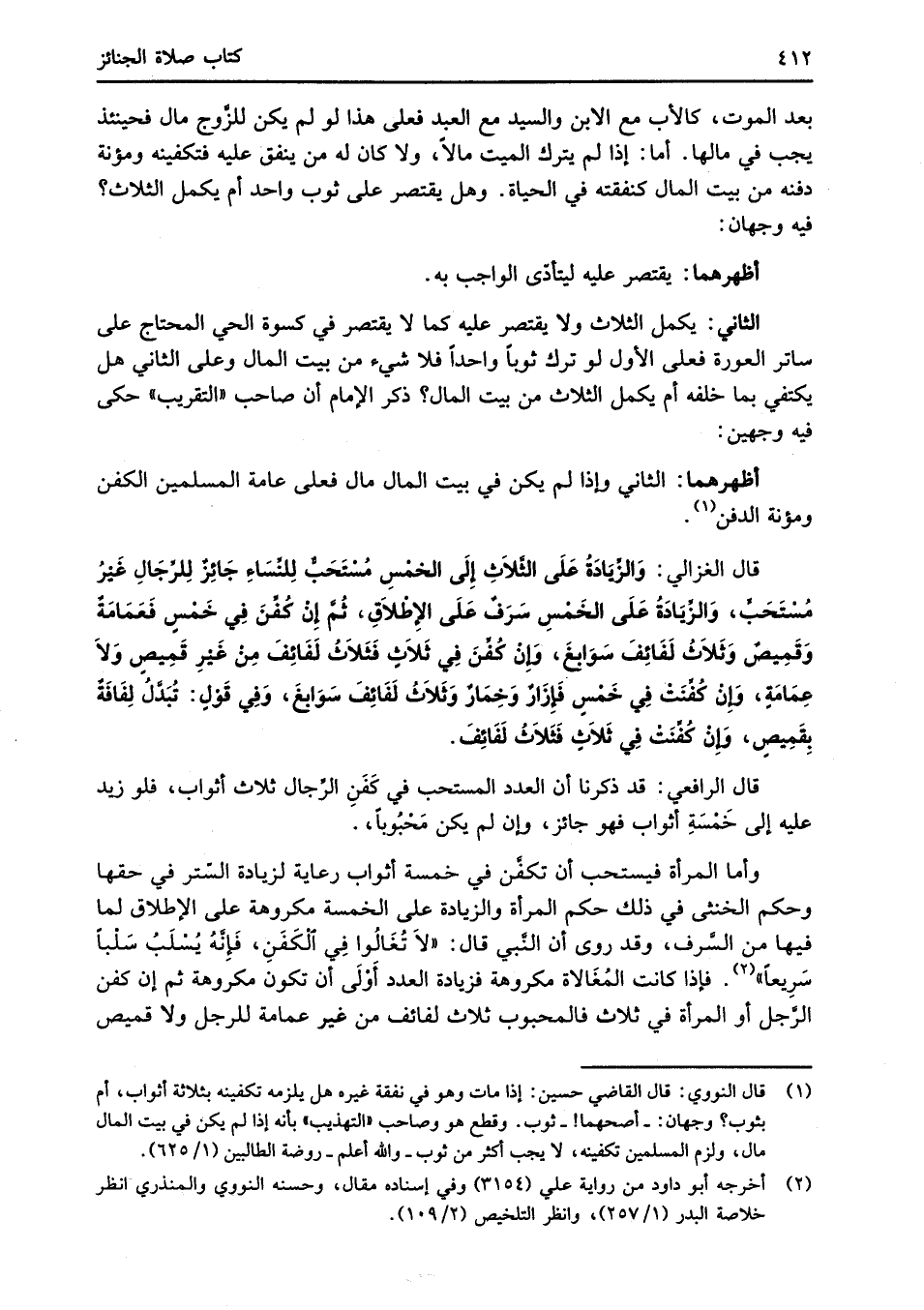 بعد الموت، كالأب مع الابن والسيد مع العبد فعلى هذا لو لم يكن للزَّوج مال فحينئذ يجب في مالها. أما: إذا لم يترك الميت مالاً، ولا كان له من ينفق عليه فتكفينه ومؤنة دفنه من بيت المال كنفقته في الحياة. وهل يقتصر على ثوب واحد أم يكمل الثلاث؟ فيه وجهان: