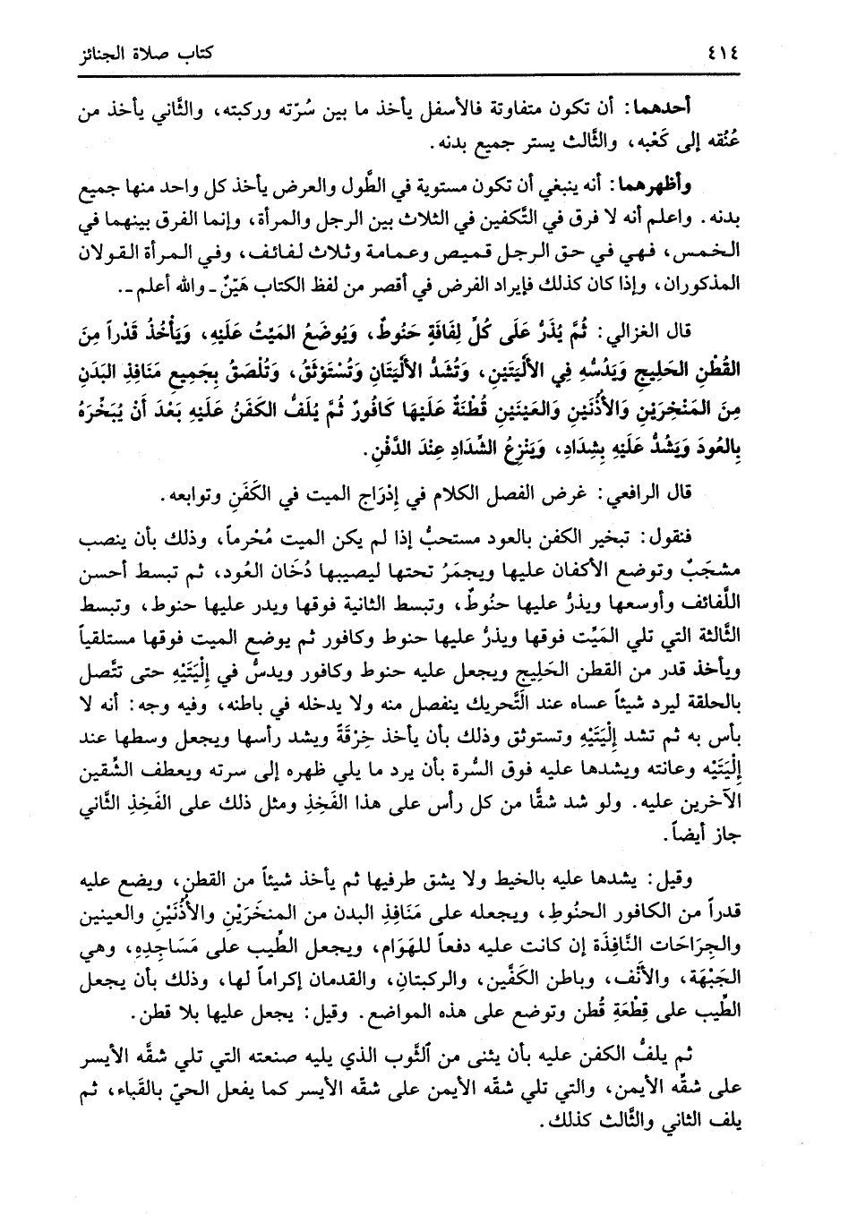 قال الغزالي: ثُمَّ يُذَرُّ عَلَى كُلِّ لِفَافَةٍ حَنُوطٌ، وَيُوضَعُ المَيِّتُ عَلَيْهِ، وَيأْخُذُ قَدْراً مِنَ القُطْنِ الحَلِيجِ وَيدُسُّهِ فِي الألْيَتَيْنِ، وَتُشَدُّ الألْيَتَانِ وَتُسْتَوْثَقُ، وَتُلْصَقُ بِجَمِيعِ مَنَافِذِ البَدَنِ مِنَ المَنْخِرَيْنِ وَالأُذُنيْنِ وَالعَيْنَيْنِ قُطْنَةٌ عَلَيْهَا كَافُورٌ ثُمَّ يُلَفُّ الكَفَنُ عَلَيْهِ بَعْدَ أَنْ يُبَخِّرَهُ بِالعُودَ وَيشُدُّ عَلَيْهِ بِشِدَادِ، وَبَنْزِعُ الشِّدَادِ عِنْدَ الدَّفْنِ.