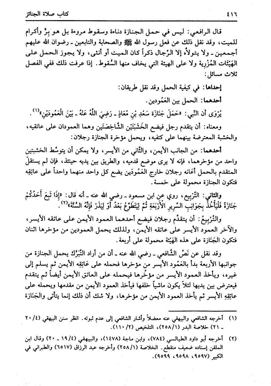 أحدهما: من الجانب الأيمن، والثَّاني من الأيسر، ولا يمكن أن يتوسَّط الخشبتين واحد من مؤخرهما، فإنه لا يرى موضع قدميه، والطريق بين يديه حينئذ، فإن لم يستقلّ التقدم بالحمل أعَانه رجلان خارج العَمُودَين يضع كل واحد منهما واحداً على عاتِقِه فتكون الجنازة محمولة على خمسة.