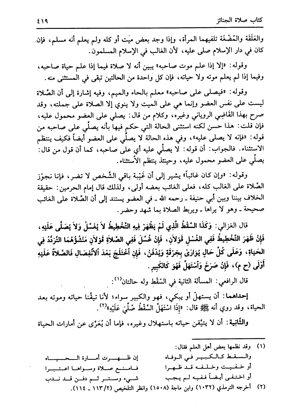 قال الغزالي: وَكَذَا السَّقْطُ الَّذِي لَمْ يَظْهَرْ فِيهِ التَّخْطِيطُ لاَ يُغَسَّلُ وَلاَ يُصَلَّى عَلَيْهِ، فَإِنْ ظَهَرَ التَّخْطِيطُ فَفِي الغُسْلِ قَوْلاَنِ، فَإِنْ غُسِّلَ فَفِي الصَّلاَةِ قَوْلاَنِ مَنْشُؤُهُمَا التَّرَدُّدُ فِي الحَيَاةِ، وَعَلَى كُلِّ حَالٍ يُوَارَى بِخِرْقَةِ وَيُدْفَنُ، فإنِ اخْتَلَجَ بَعْدَ الانْفِصَالِ فَالصَّلاةُ عَلَيْهِ أَوْلَى (ح م)، فَإِنْ صَرَخَ وَاسْتَهَلَّ فَهُوَ كَالكَبِيرِ.
