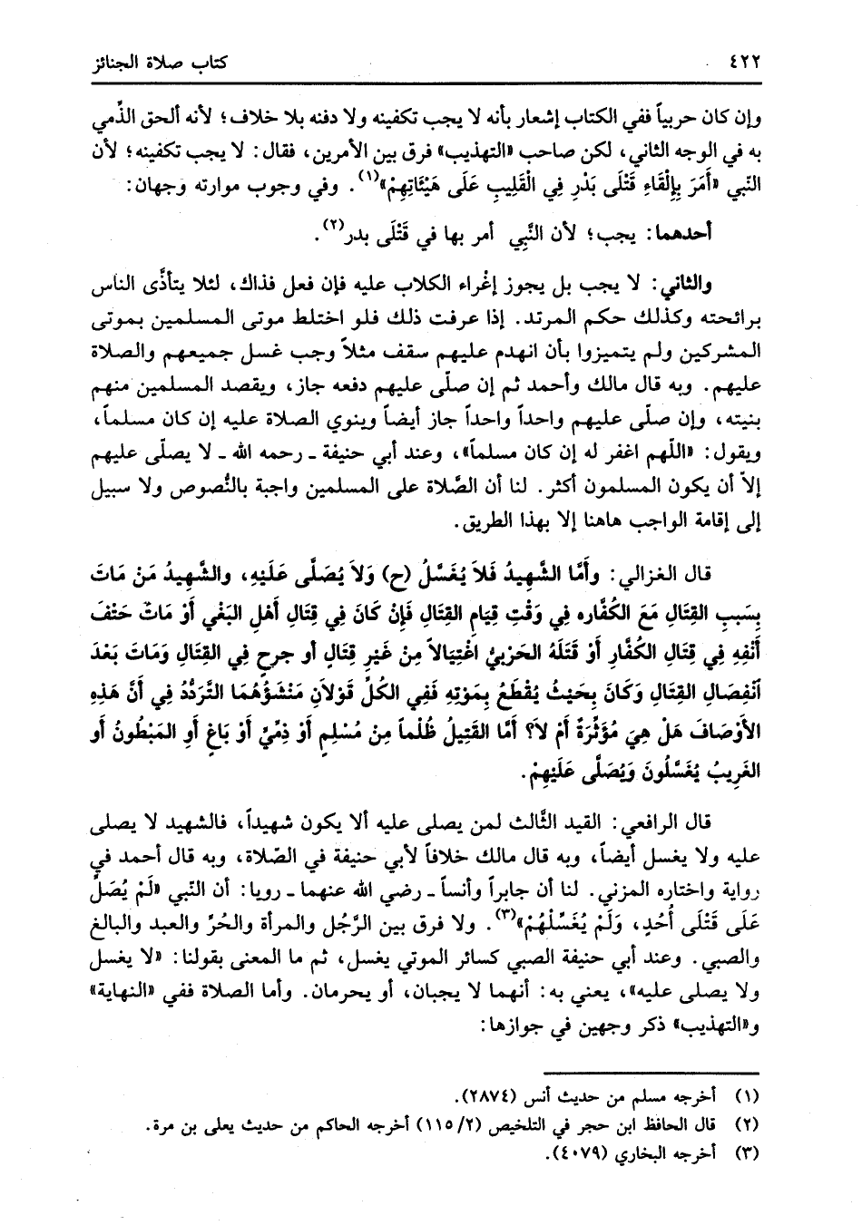 قال الغزالي: وأَمَّا الشَّهِيدُ فلاَ يُغَسَّلُ (ح) وَلاَ يُصَلَّى عَلَيْهِ، والشَّهِيدُ مَنْ مَاتَ بِسَببِ القِتَالِ مَعَ الكُفَّار فِي وَقْتِ قِيَامِ القِتَالِ فَإِنْ كانَ فِي قِتَالِ أَهْلِ البَغْي أَوْ مَات حَتْفَ أَنْفِهِ فِي قِتَالِ الكُفَّارِ أَوْ قَتَلَهُ الحَرْبيُّ اغْتِيَالاً مِنْ غيْرِ قِتَالٍ أو جرحٍ فِي القِتَالِ وَمَاتَ بَعْدَ انْفِصَالِ القِتَالِ وَكَانَ بحَيْثُ يُقْطَع بِمَوْتهِ فَفِي الكُلِّ قَوْلاَنِ مَنْشَؤُهُمَا التَّرَدُّدُ فِي أَنَّ هَذِهِ الأَوْصَافَ هَلْ هِيَ مُؤَثِّرَةٌ أَمْ لاَ؟ أَمَّا القَتِيلُ ظُلْمًا مِنْ مُسْلِم أَوْ ذِمِّيِّ أَوْ بَاغ أَوِ المَبْطُونُ أَو الغَرِيبُ يُغَسَّلُونَ وَيُصَلَّى عَلَيْهِمْ.
