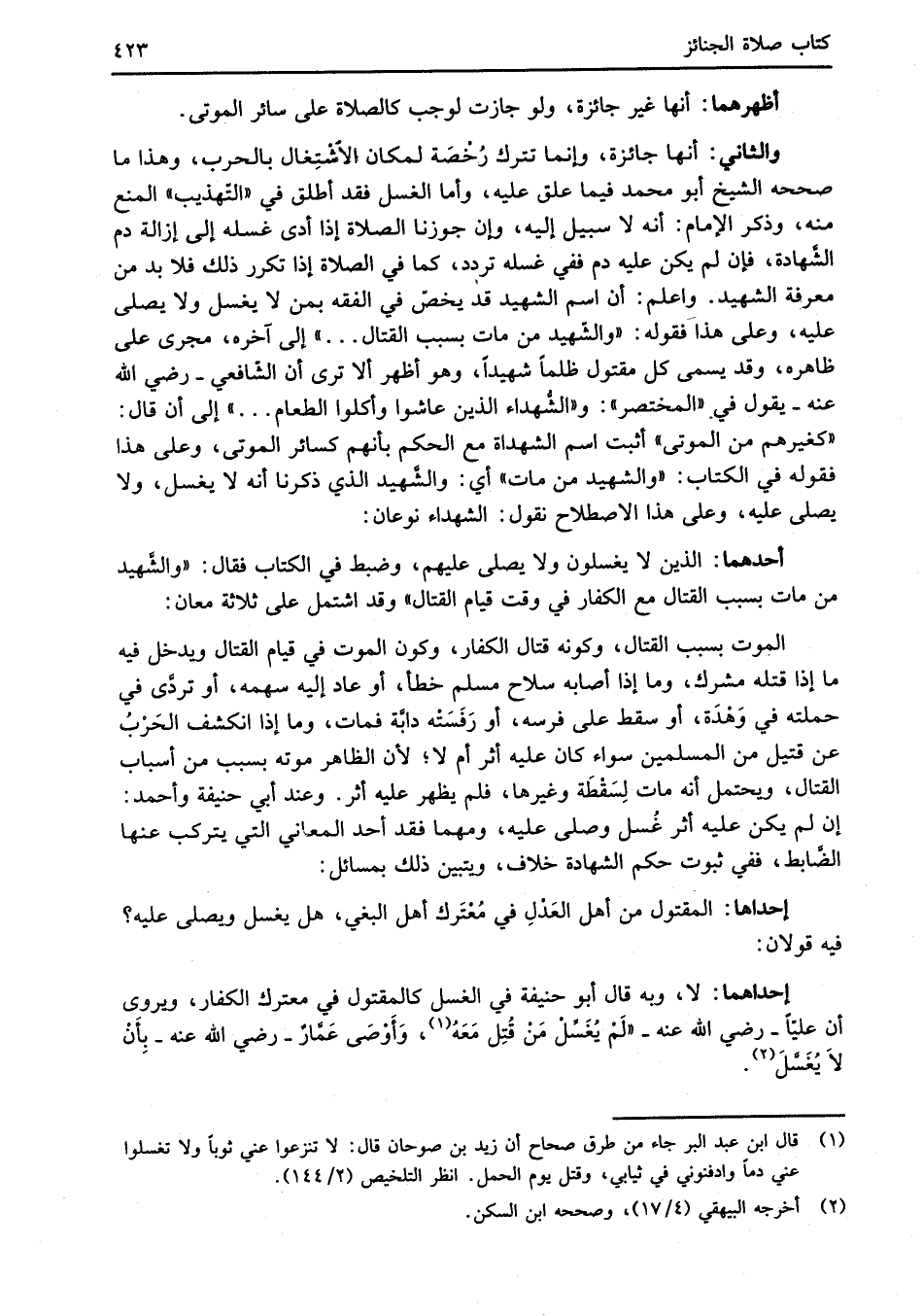 (¬1) قال ابن عبد البر جاء من طرق صحاح أن زيد بن صوحان قال: لا تنزعوا عني ثوباً ولا تغسلوا عني دماً وادفنوني في ثيابي، وقتل يوم الحمل. انظر التلخيص (2/ 144).