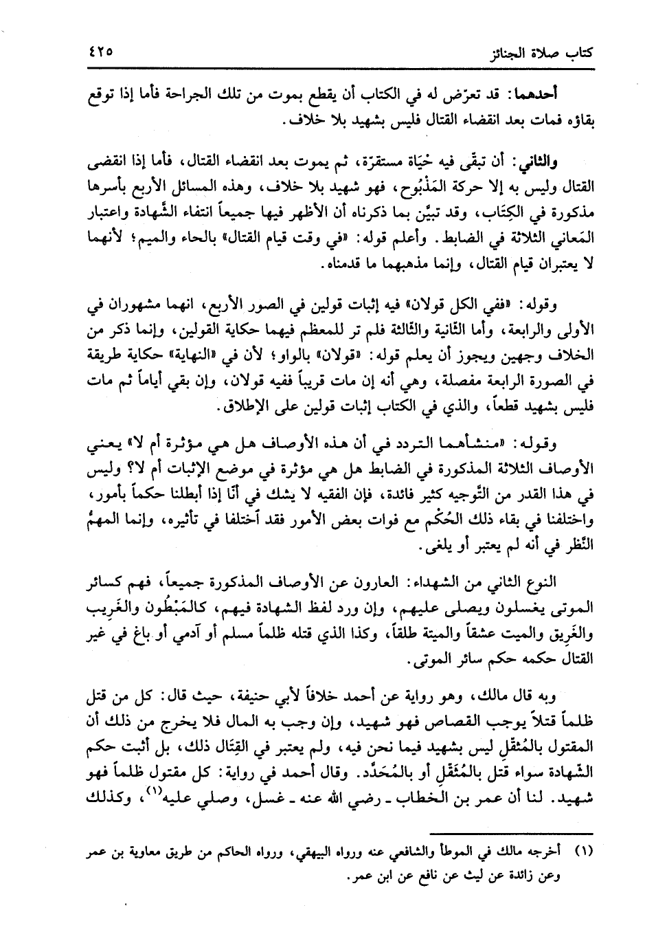 وبه قال مالك، وهو رواية عن أحمد خلافاً لأبي حنيفة، حيث قال: كل من قتل ظلماً قتلاً يوجب القصاص فهو شهيد، وإنْ وجب به المال فلا يخرج من ذلك أن المقتول بالمُثقّلِ ليس بشهيد فيما نحن فيه، ولم يعتبر في القِتَال ذلك، بل أثبت حكم الشّهادة سواء قتل بالمُثَقّلِ أو بالمُحَدَّد. وقال أحمد في رواية: كل مقتول ظلماً فهو شهيد. لنا أن عمر بن الخطاب -رضي الله عنه- غسل، وصلي عليه (¬1)، وكذلك
