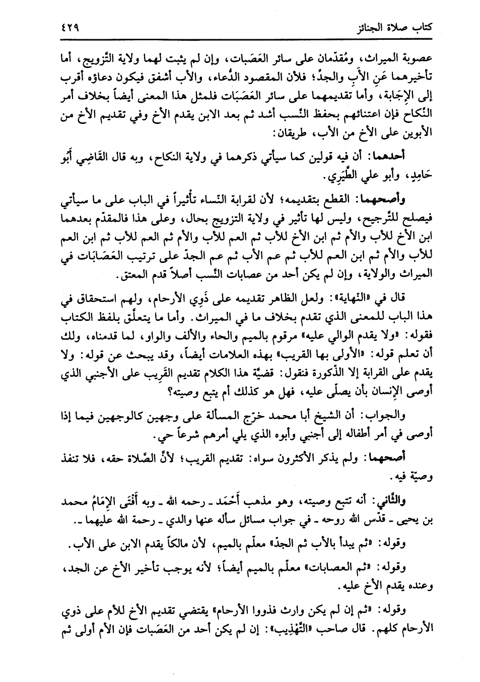 قال في "النّهاية": ولعل الظاهر تقديمه على ذَوِي الأرحام، ولهم استحقاق في هذا الباب للمعنى الدم تقدم بخلاف ما في الميراث. وأما ما يتعلَّق بلفظ الكتاب فقوله: "ولا يقدم الوالي عليه" مرقوم بالميم والحاء والألف والواو، لما قدمناه، ولك أن تعلم قوله: "الأولى بها القريب" بهذه العلامات أيضاً، وقد يبحث عن قوله: ولا يقدم على القرابة إلا الذّكورة فنقول: قضيَّة هذا الكلام تقديم القَرِيب على الأجنبي الذي أوصى الإِنسان بأن يصلّى عليه، فهل هو كذلك أم يتبع وصيته؟