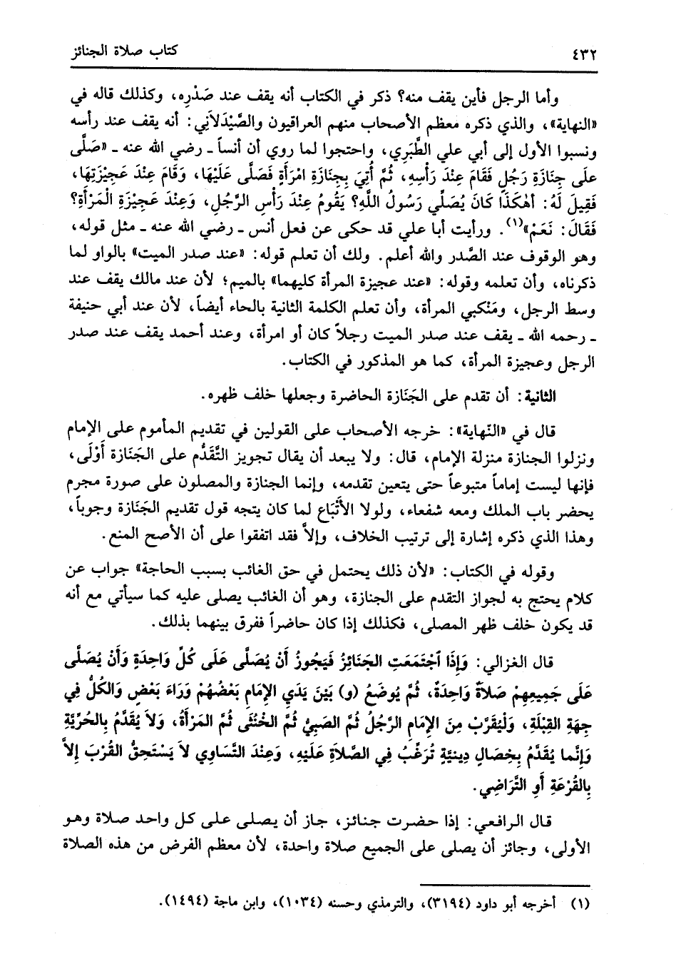 وأما الرجل فأين يقف منه؟ ذكر في الكتاب أنه يقف عند صَدْرِه، وكذلك قاله في "النهاية"، والذي ذكره معظم الأصحاب منهم العراقيون والصَّيْدَلاَنِي: أنه يقف عند رأسه ونسبوا الأول إلى أبي علي الطَّبَرِي، واحتجوا لما روي أن أنساً -رضي الله عنه- "صَلَّى علَى جنَازَةِ رَجُل فَقَامَ عِنْدَ رَأسِهِ، ثُمَّ أُتِيَ بِجِنَازَةِ امْرَأَة فَصَلَّى عَلَيْهَا، وَقَامَ عِنْدَ عَجِيْزَتِهَا، فَقِيلَ لَهُ: أهكَذًا كَانَ يُصَلِّي رَسُولُ اللهِ؟ يَقُومُ عِنْدَ رَأسِ الرَّجُلِ، وَعِنْدَ عَجِيْزَةِ الْمَرْأَةِ؟ فَقَالَ: نَعَمْ" (¬1). ورأيت أبا علي قد حكى عن فعل أنس -رضي الله عنه- مثل قوله، وهو الوقوف عند الصَّدر والله أعلم. ولك أن تعلم قوله: "عند صدر الميت" بالواو لما ذكرناه، وأن تعلمه وقوله: "عند عجيزة المرأة كليهما" بالميم؛ لأن عند مالك يقف عند وسط الرجل، ومَنْكبي المرأة، وأن تعلم الكلمة الثانية بالحاء أيضاً، لأن عند أبي حنيفة -رحمه الله- يقف عند صدر الميت رجلاً كان أو امرأة، وعند أحمد يقف عند صدر الرجل وعجيزة المرأة، كما هو المذكور في الكتاب.