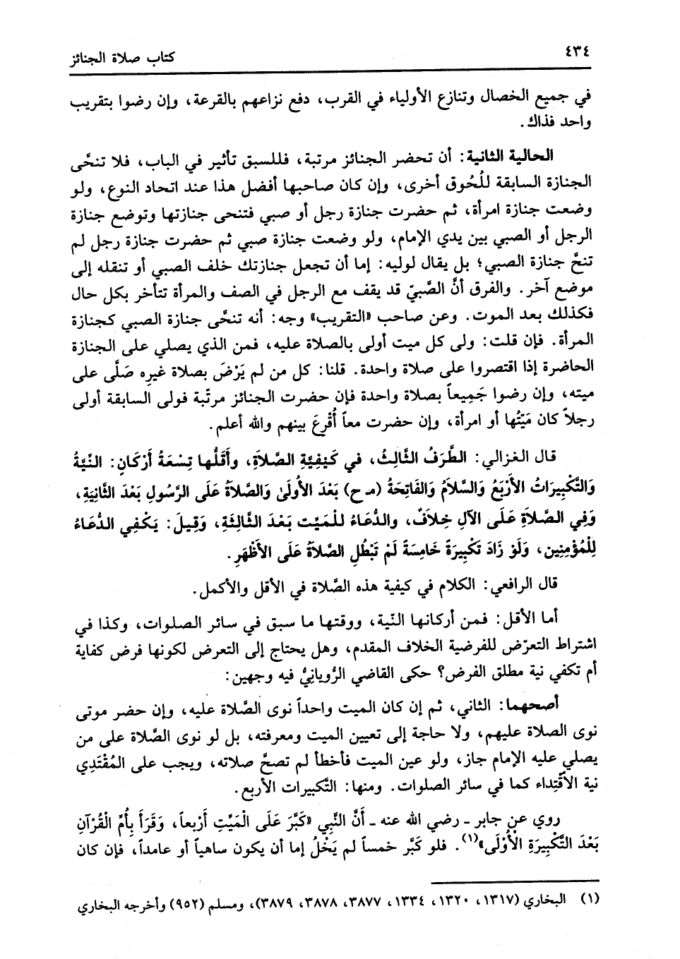 قال الغزالي: الطَّرَفُ الثَّالِثُ، في كَيْفِيَّةِ الصَّلاَةِ، وأَقَلُّها تِسْعَة أَرْكَانِ: النِّيَّةُ وَالتَّكبِيرَاتُ الأَرْبَعُ وَالسَّلاَمُ وَالفَاتِحَةُ (م ح) بَعْدَ الأُولَى وَالصَّلاةُ عَلَى الرَّسُولِ بَعْدَ الثَّانِيَةِ، وَفِي الصَّلاَةِ عَلَى الآلِ خِلاَفٌ، والدُّعَاءُ للْمَيِّت بَعْدَ الثَّالِثَةِ، وَقِيلَ: يَكْفِي الدُّعَاءُ لِلْمُؤْمِنِين، وَلَوْ زَادَ تكْبِيرَةٌ خَامِسَةً لَمْ تَبْطُلِ الصَّلاَةُ عَلَى الأَظْهَرِ.