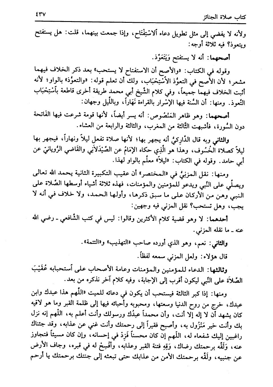 ومنها: إذا كبر الثالثة فيستحب أن يكون في دعائه للميت "اللَّهم هذا عبدك وابن عبدك، خرج من روح الدنيا وسعتها، ومحبوبه وأحبائه فيها إلى ظلمة القبر وما هو لاقيه كان يشهد أن لا إله إلا أنت، وأن محمداً عبدُك ورسولك وأنت أعلم به، اللهم إنه نزل بك وأنت خير مَنْزُول به، وأصبح فقيراً إلى رحمتك وأنت غني عن عذابه، وقد جئناك راغبين إليك شفعاء له، اللهم إن كان محسناً فَزِدْ في إحسانه، وإن كان مسيئاً فتجاوز عنه، وَلَقِّه برحمتك رضاك، وَقِهِ فتنة القبر وعذابه، وأفْسِحْ له في قبره، وجاف الأرض عن جنبيه، ولَقِّه برحمتك الأمن من عذابك حتى تبعثه إلى جنتك برحمتك يا أرحم