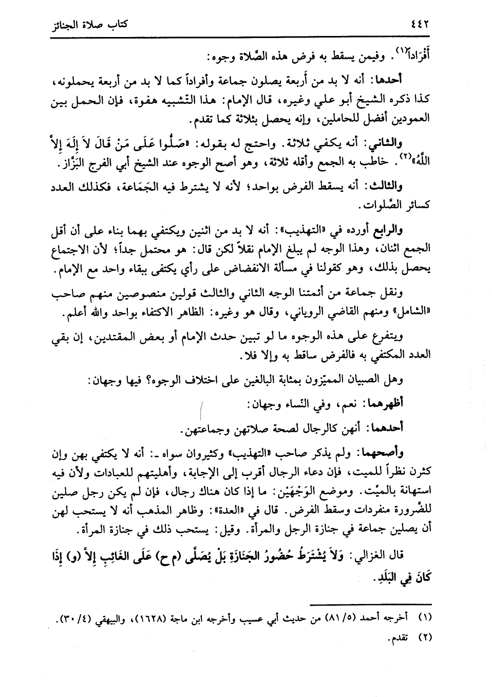 والثاني: أنه يكفي ثلاثة. واحتج له بقوله: "صَلُّوا عَلَى مَنْ قَالَ لاَ إِلَهَ إِلاَّ اللهُ" (¬2). خاطب به الجمع وأقله ثلاثة، وهو أصح الوجوه عند الشيخ أبي الفرج البَزَّاز.
